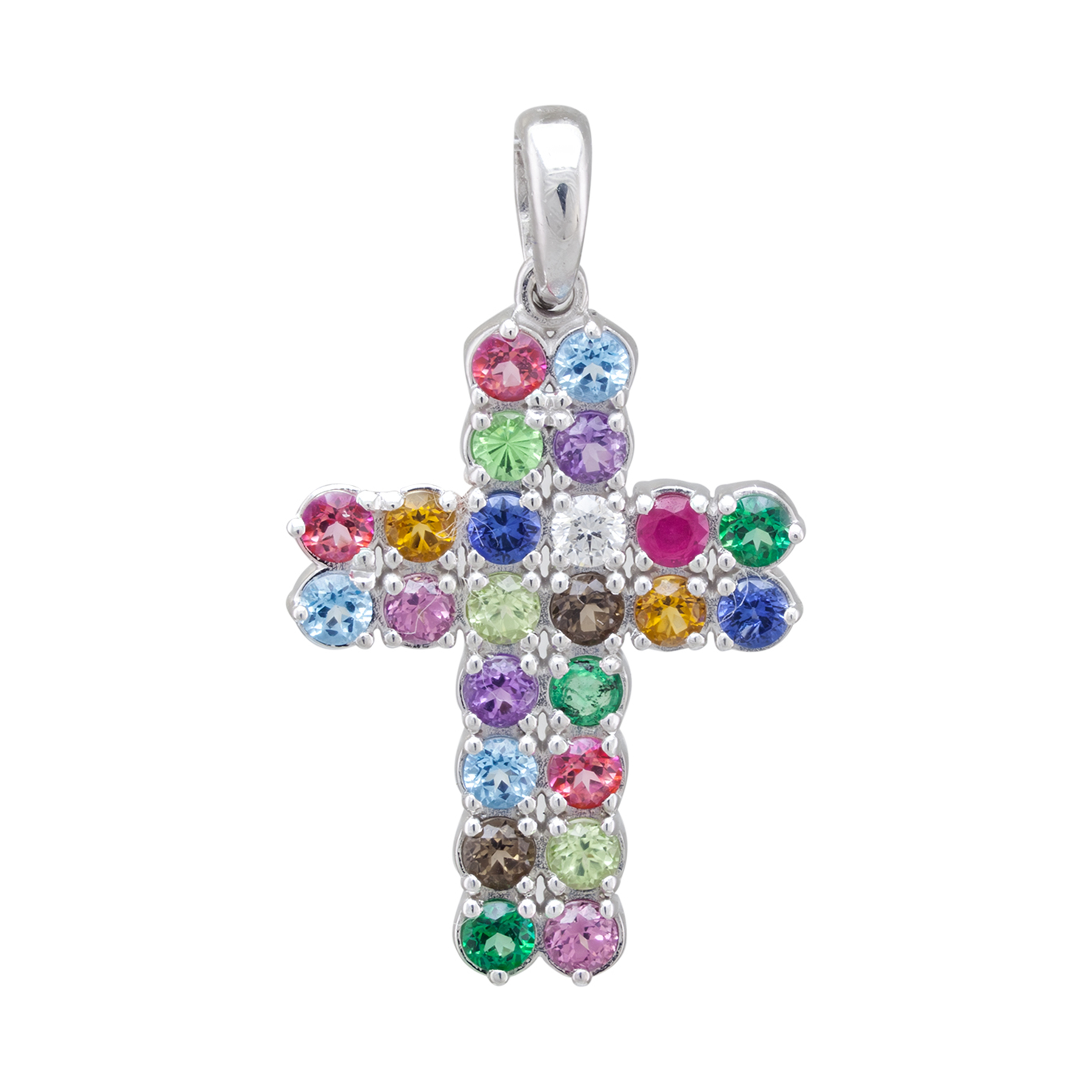 Efektan privezak u obliku je krstića. Napravljen je od zlata, a ukrašen je raznobojnim dragim kamenjem i jednim brilijantom.