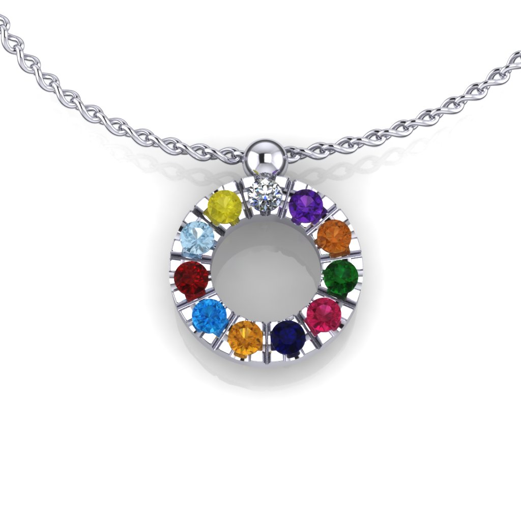 Privezak od zlata u obliku kruga, ukrašen sa 11 dragulja različite boje. Privezak je napravljen od najkvalitetnijeg 14-karatnog zlata i ima stilizovanu alkicu za lančić. Kada se privezak okači na lančić, izgleda kao da prolazi kroz malu zlatnu kuglicu. Zlatni privesci zlatare Andrejević mogu biti izrađeni u bilo kojoj od 3 boje zlata: beloj, roze, ili žutoj. Uz to, u zlatari Andrejević, nudimo Vam mogućnost da sami izaberete karatažu, čistoću i boju dijamanta kako biste bili sigurni da će privesci biti upravo onakvi kakve ste želeli.