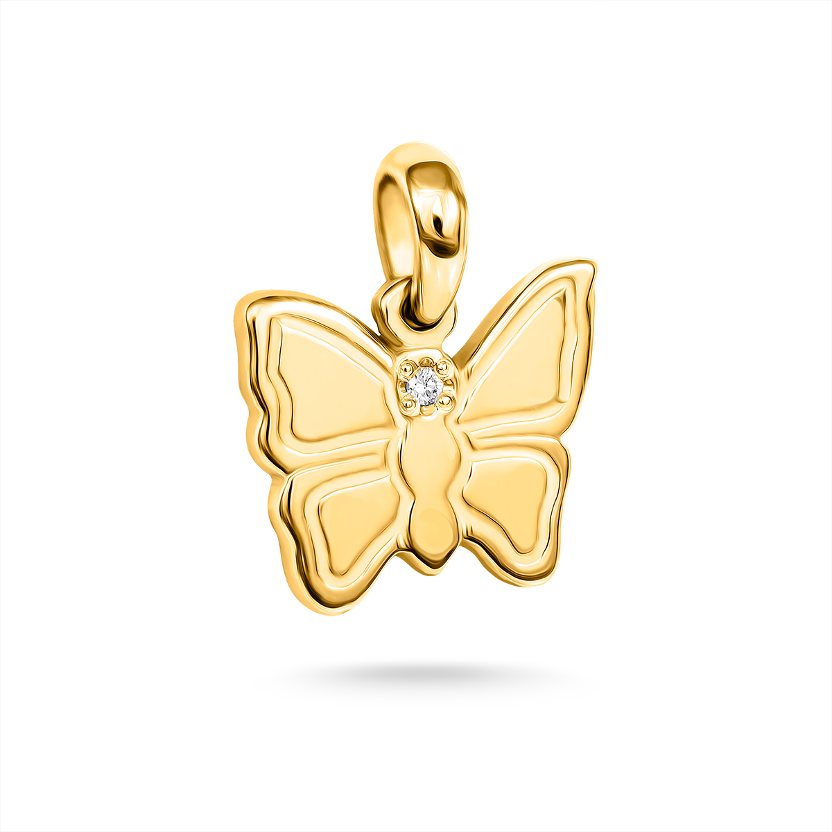 Privezak od zlata u obliku leptira sa malim dijamantom brilijantskog reza. Privezak je napravljen od kvalitetnog 14-karatnog zlata i ima alku u obliku suze kroz koju može da prođe lanćić srednje debljine. Privezak je jednostavan i diskretno izgraviran kako bi što više nalikovao pravom leptiru, a ispod alke ufasovan je dijamant. Dijamant ima četiri držača oblih vrhova koji su lepo brušeni i neće zapinjati za kosu ili odeću. Zlatni privesci zlatare Andrejević mogu biti izrađeni u bilo kojoj od 3 boje zlata: beloj, roze, ili žutoj, a kombinaciju boja zlata možete sami da odaberete. Uz to, u zlatari Andrejević, nudimo Vam mogućnost da sami izaberete karatažu, čistoću i boju dijamanta kako biste bili sigurni da će privesci biti upravo onakvi kakve ste želeli.