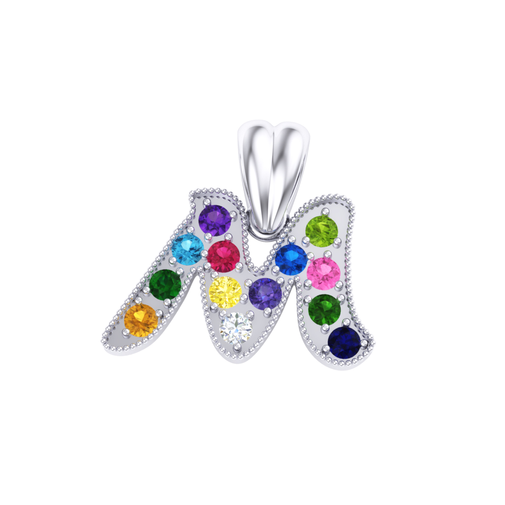 Privezak od zlata iz kolekcije Tutti Frutti u obliku slova M. Ovaj zlatni privezak krasi čak 13 raznobojnih dragulja, a klasična alka na njegovom vrhu omogućava da se nosi i na lančiću srednje debljine ili pak na narukvici. Zlatni privesci zlatare Andrejević mogu biti izrađeni u bilo kojoj od 3 boje zlata: beloj, roze, ili žutoj. Uz to, u zlatari Andrejević, nudimo Vam mogućnost da sami izaberete karatažu, čistoću i boju dijamanta i drugog dragog kamenja kako biste bili sigurni da će privesci biti upravo onakvi kakve ste želeli.