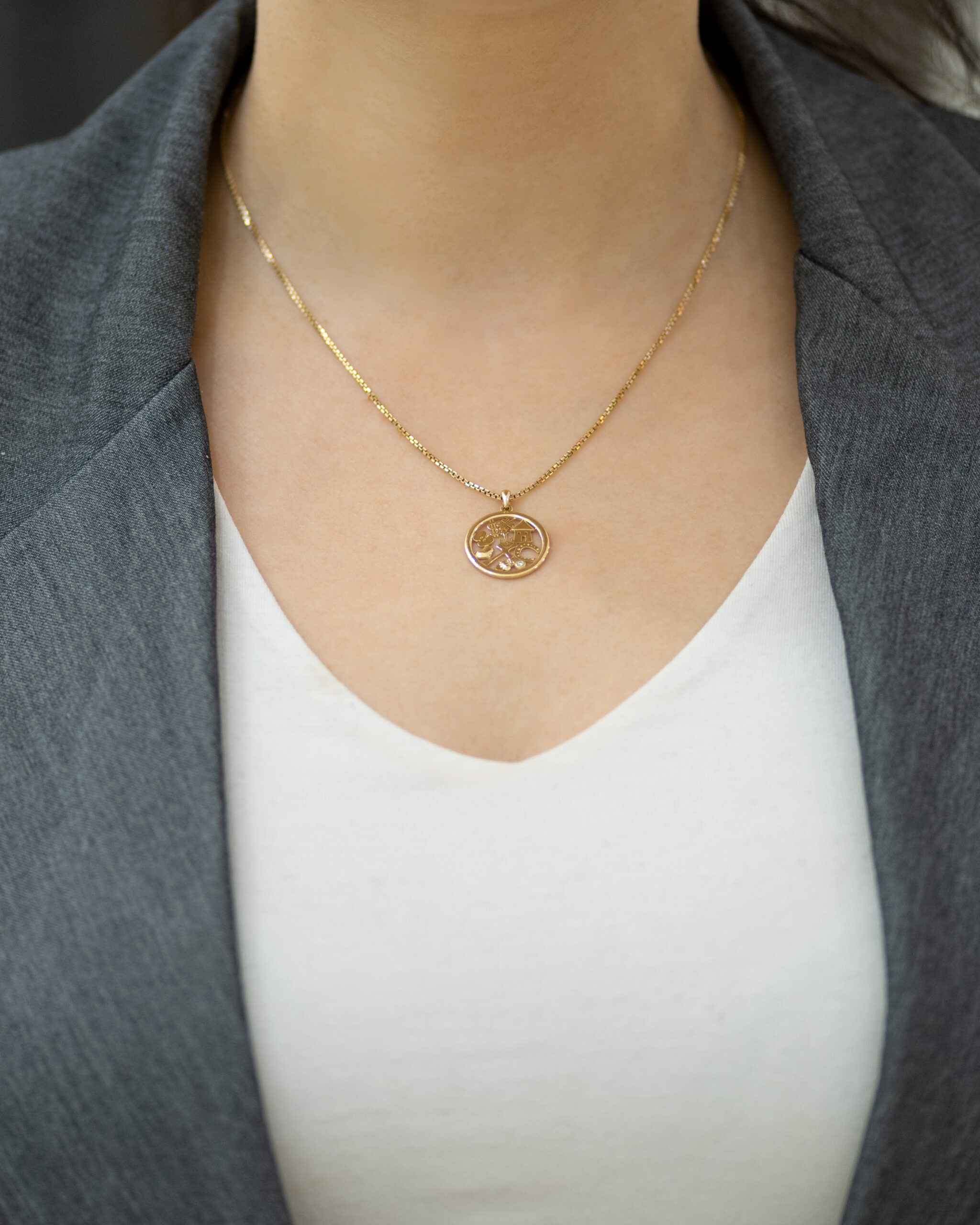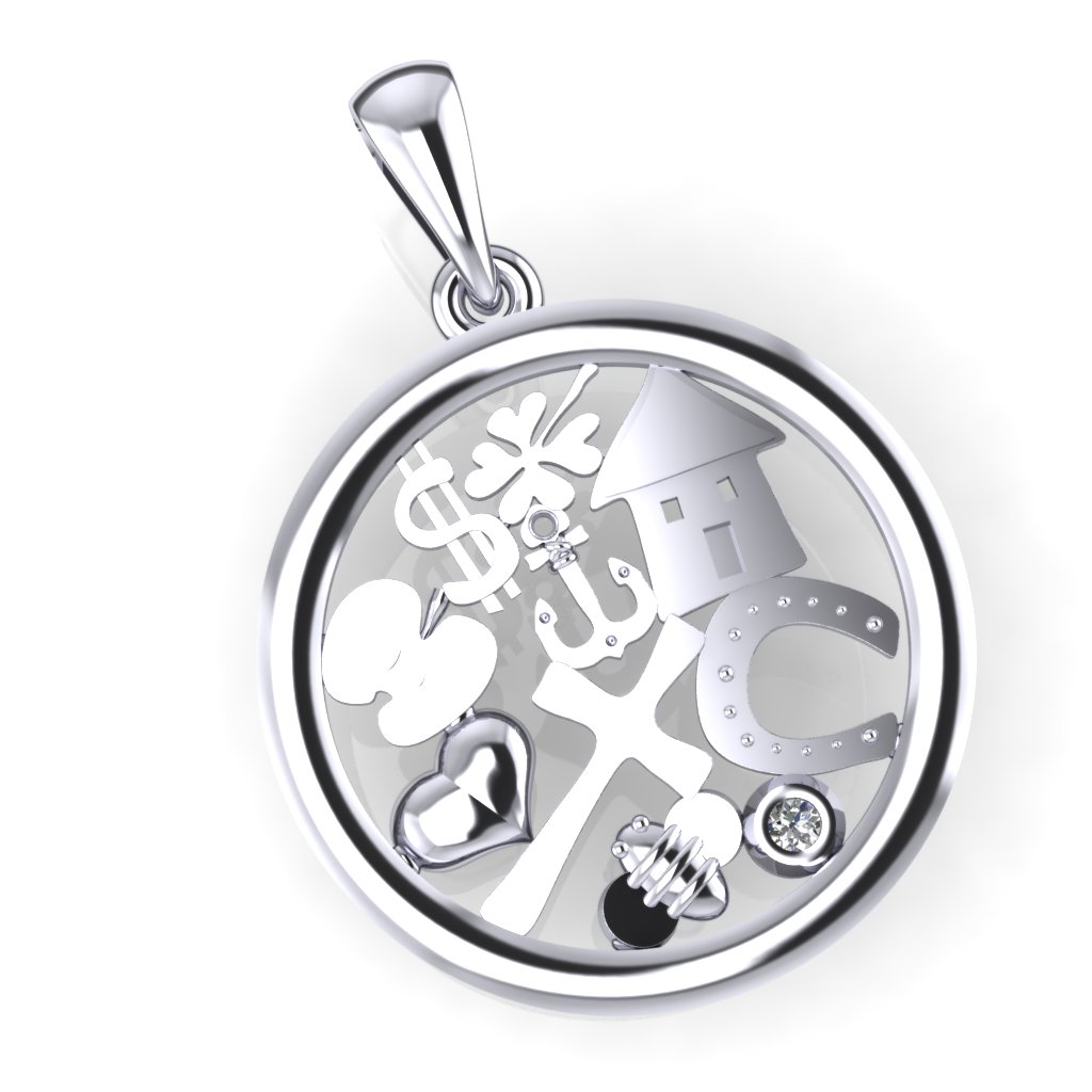 Privezak od zlata okruglog oblika sa jednim dijamantom. Privezak je nalik na medaljon, prepun simbola koji donose sreću i pružaju zaštitu: krst, potkovica, srce, sidro, detelina sa četiri lista, kuća, znak za dolar, pčela i jabuka. Ovaj zlatni privezak ima klasičnu alku, a napravljen je od najkvalitentijeg zlata. Zlatni privesci zlatare Andrejević mogu biti izrađeni u bilo kojoj od 3 boje zlata: beloj, roze, ili žutoj. Uz to, u zlatari Andrejević, nudimo Vam mogućnost da sami izaberete karatažu, čistoću i boju dijamanta i drugog dragog kamenja, kako biste bili sigurni da će privesci biti upravo onakvi kakve ste želeli.