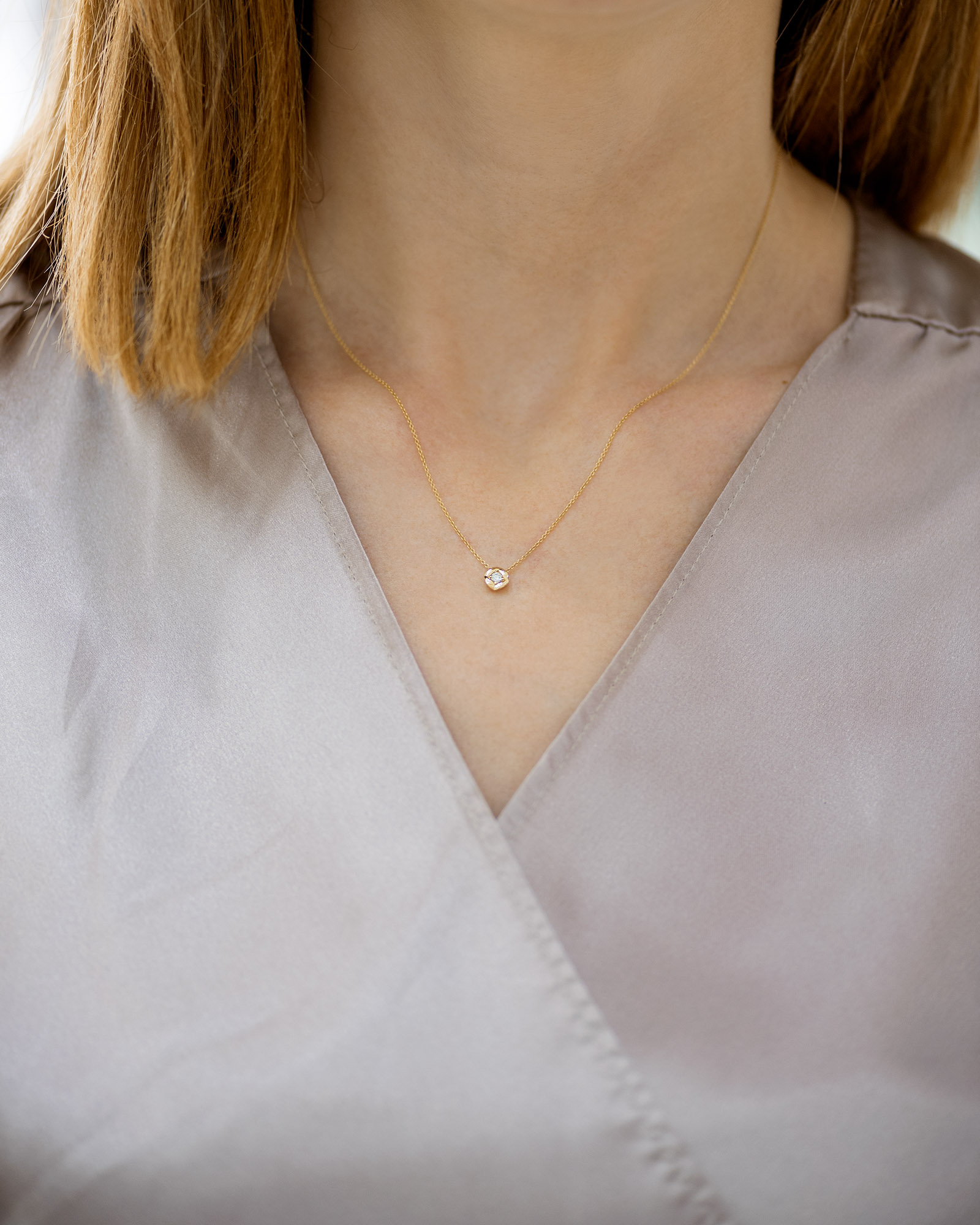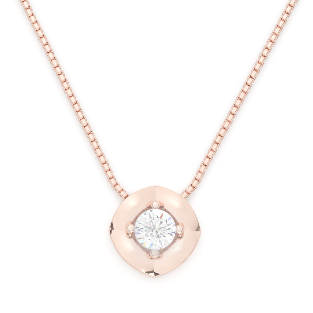 Privezak od zlata okruglog oblika koji krasi jedan dijamant brilijantskog reza. Privezak nema klasičnu alku za lančič, već je lančič sakriven na zadnjoj strani. Dijamant je pričvršćen sa četiri oblo brušena držača, a krug oko njega je neravnog oblika i izdeljen na četiri dela, tako da pomalo nalikuje laticama cveta. Zlatni privesci zlatare Andrejević mogu biti izrađeni u bilo kojoj od 3 boje zlata: beloj, roze, ili žutoj. Uz to, u zlatari Andrejević, nudimo Vam mogućnost da sami izaberete karatažu, čistoću i boju dijamanta kako biste bili sigurni da će privesci biti upravo onakvi kakve ste želeli.