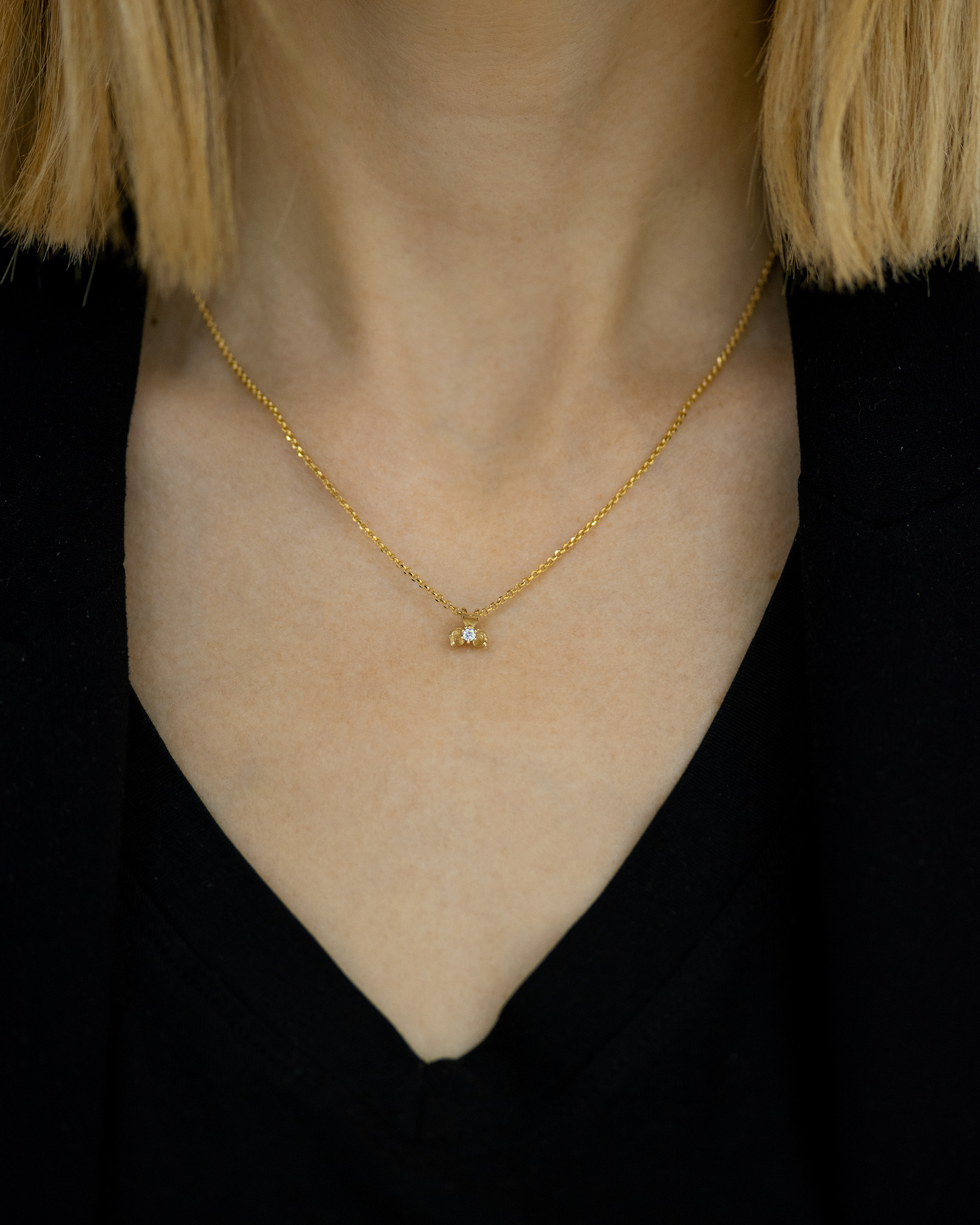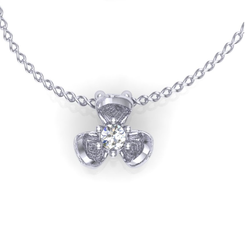 Nežan privezak od belog zlata u obliku je cveta sa tri latice. Latice su blago savijene ka unutrašnjosti cveta, gde se krije dijamant raskošnog sjaja. Privezak je deo Andrejević kolekcije.
