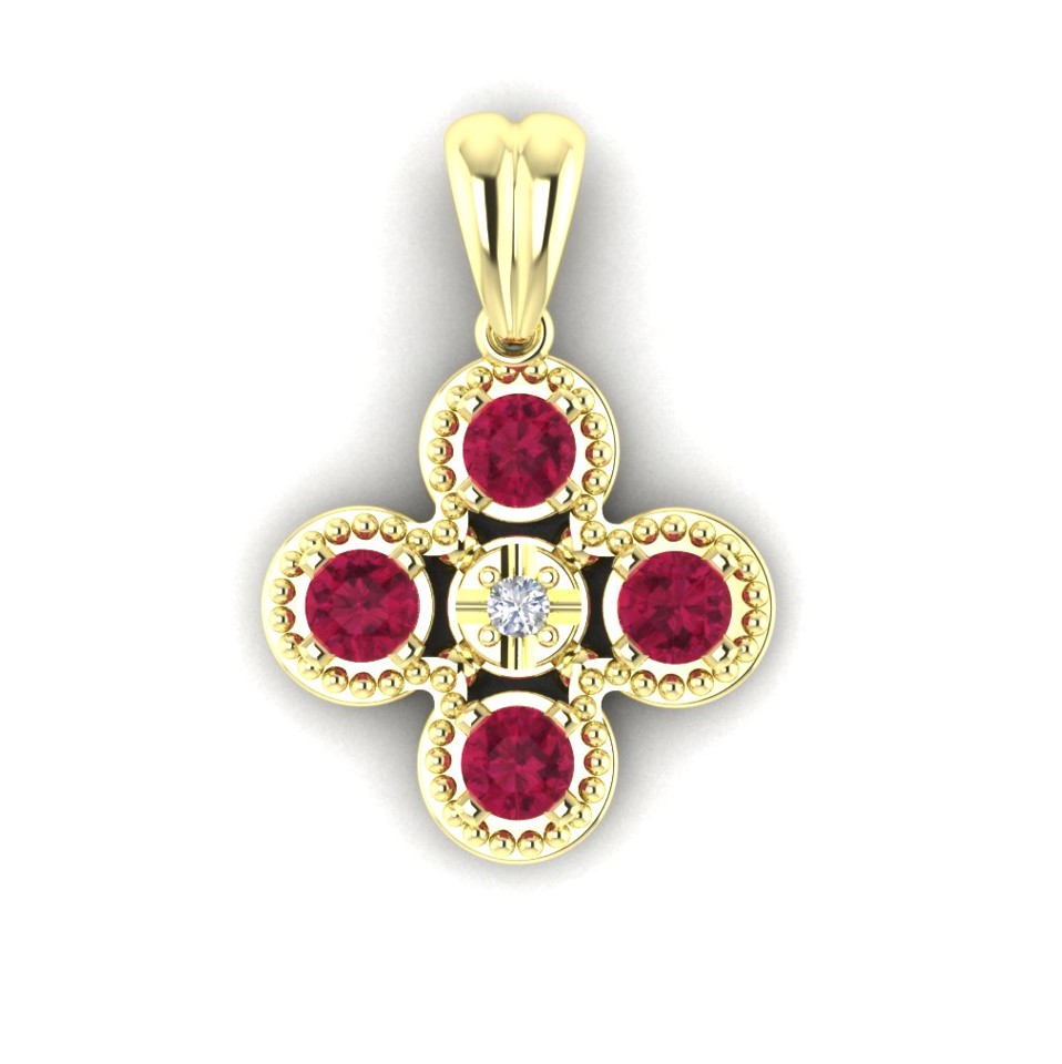Privezak od zlata sa dragim kamenjem koji oblikom podseća na detelinu sa četiri lista. Privezak je oblikovan od četiri kruga jednake veličine koji okružuju peti, centralni i ima klasičnu alku. U centralni krug ufasovan je dijamant, dok se u ostalima nalaze zagasiti topazi. Oko dragog kamenja nalaze se sitne zlatne kuglice koje privesku daju zanimljivu teksturu. Zlatni privesci zlatare Andrejević mogu biti izrađeni u bilo kojoj od 3 boje zlata: beloj, roze, ili žutoj. Uz to, u zlatari Andrejević, nudimo Vam mogućnost da sami izaberete karatažu, čistoću i boju dijamanata i drugog dragog kamenja kako biste bili sigurni da će privesci biti upravo onakvi kakve ste želeli.
