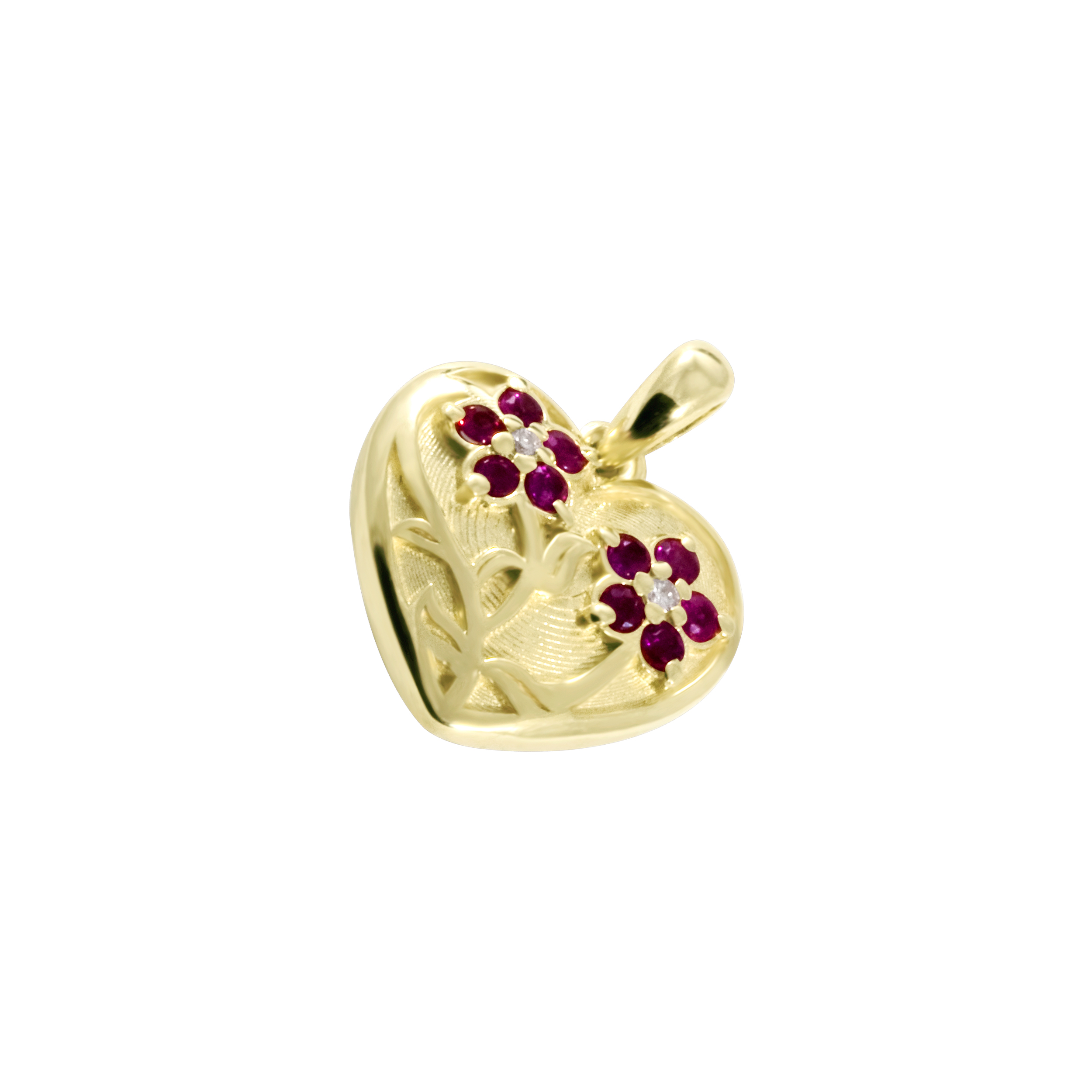 Privezak od zlata u obliku predivno izrezbarenog srca koje krasi deset rubina kao i dva dijamanta brilijantskog reza. Privezak je izrađen od 14-karatnog zlata izuzetnog sjaja i kvaliteta, a površina srca je izrezbarena tako da izgleda da su njemu dva delikatna cveta. Cveće ima latice od rubina i brilijantski centar, a stabljike i lišće se protežu po površini srca. Alka za lančić je dovoljno velika da kroz nju prođe lanac srednje debljine. Zlatni privesci zlatare Andrejević mogu biti izrađeni u bilo kojoj od 3 boje zlata: beloj, roze, ili žutoj. Uz to, u zlatari Andrejević, nudimo Vam mogućnost da sami izaberete karatažu, čistoću i boju dijamanta kako biste bili sigurni da će privesci biti upravo onakvi kakve ste želeli.