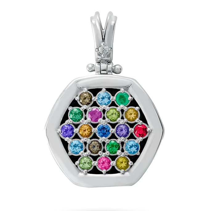 Privezak od zlata šestougaonog oblika i zaobljenih ivica koji krasi čak 20 šarenih dragulja. Alka je stilizovana, pričvršćena za privezak zlatnom iglom zaobljenih ivica, a krasi je jedan blistavi brilijant. Ovaj Tutti Frutti privezak je moderan i elegantan, privlači pažnju i predivno prelama svetlo. Zlatni privesci zlatare Andrejević mogu biti izrađeni u bilo kojoj od 3 boje zlata: beloj, roze, ili žutoj. Uz to, u zlatari Andrejević, nudimo Vam mogućnost da sami izaberete karatažu, čistoću i boju dijamanta i drugog dragog kamenja kako biste bili sigurni da će privesci biti upravo onakvi kakve ste želeli.