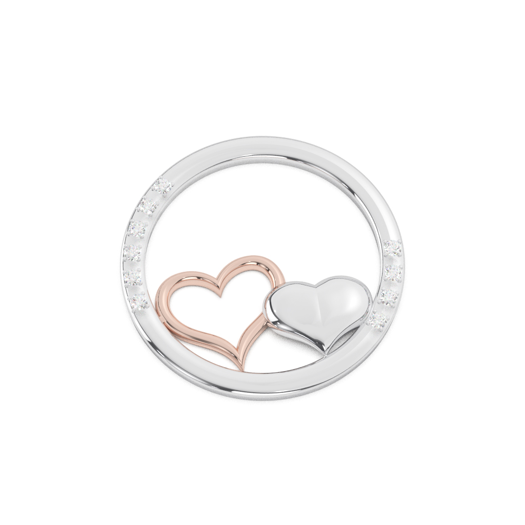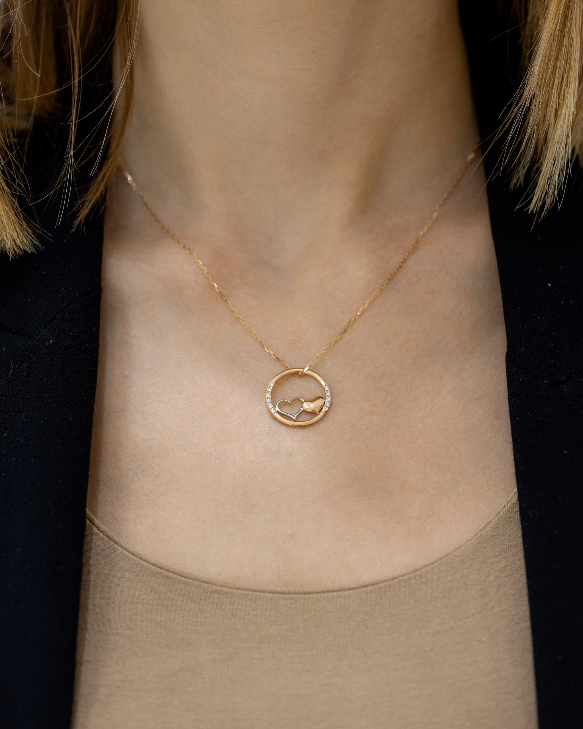 Privezak od zlata u obliku kruga ukrašen sa 10 brilijanata u kome se nalaze dva srca. Dva srca su smeštena jedno do drugog, jedno je napravljeno od punog zlata, a drugo je otvoreno u sredini. Ovaj privezak je napravljen od zlata najvišeg kvaliteta i nema klasičnu alku za lančić. Zlatni privesci zlatare Andrejević mogu biti izrađeni u bilo kojoj od 3 boje zlata: beloj, roze, ili žutoj, a kombinaciju boja zlata možete sami da odaberete . Uz to, u zlatari Andrejević, nudimo Vam mogućnost da sami izaberete karatažu, čistoću i boju dijamanta kako biste bili sigurni da će privesci biti upravo onakvi kakve ste želeli.