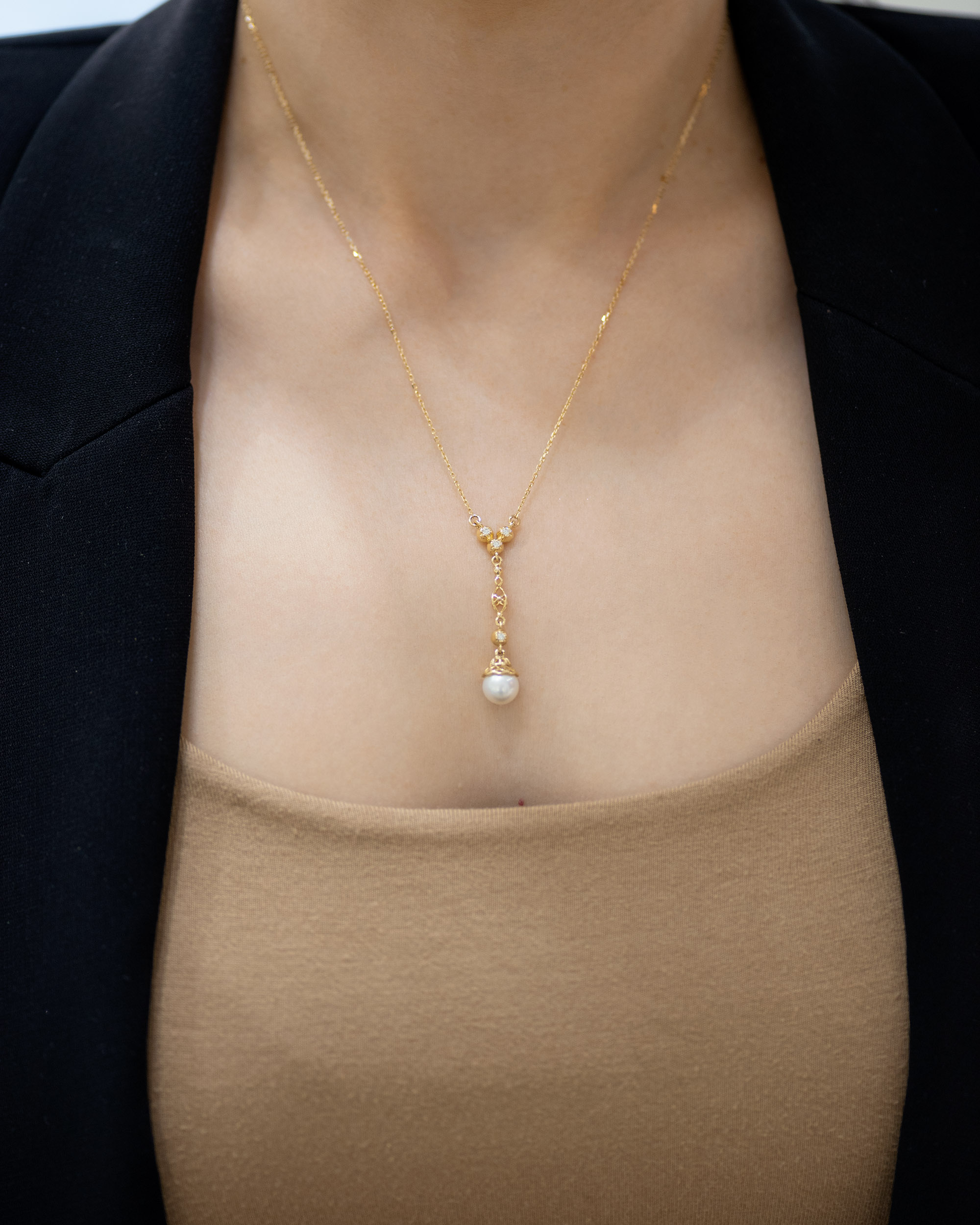 Privezak od zlata sa briijantima i biserom. Privezak je izrađen od zlata najvišeg kvaliteta i nema klasičnu alku. Umesto toga, lanac je malim alkama pričvršćen direktno za zlatne kuglice u koje su ufasovani brilijanti. Za kuglice je pričvršćeno malo zlanto umetničko delo: duguljasti ukras na kome se nalazi još jedna brilijantska kuglica i naposletku predivni biser. U zlatari Andrejević, moguća je i izrada nakita po Vašoj želji, kao i mogućnost konfigurisanja, pa naši zlatni privesci mogu biti izrađene u bilo kojoj od 3 boje zlata: beloj, roze, ili žutoj. Uz to, u zlatari Andrejević, nudimo Vam mogućnost da sami izaberete karatažu, čistoću i boju dijamanta i drugog dragog kamenja, kako biste bili sigurni da će privesci biti upravo onakvi kakve ste želeli.