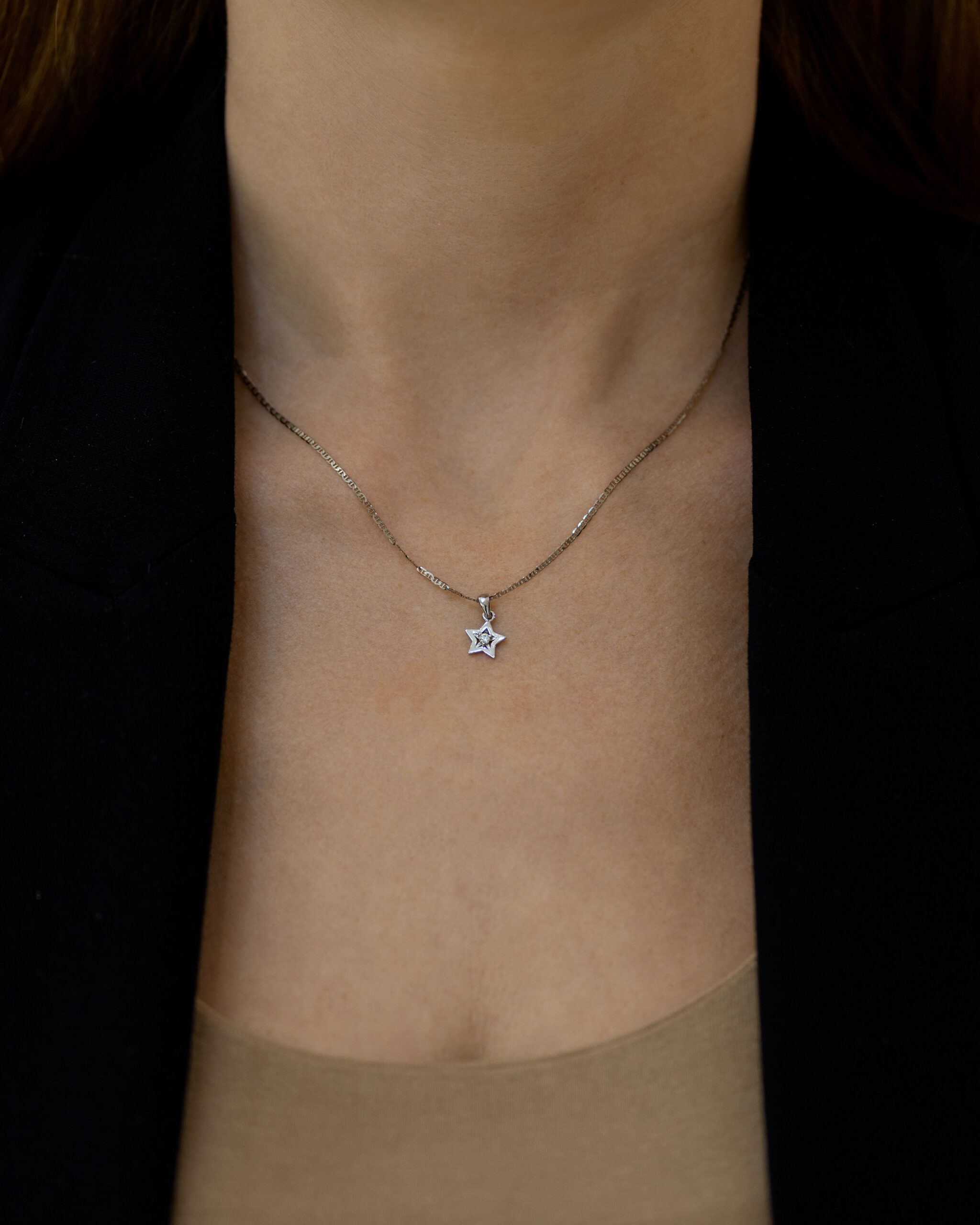 Privezak od zlata u obliku zvezde koji krasi brilijant. Privezak je napravljen od visokokvalitetnog zlata i ima alku kroz koju može da prođe lančić manje debljine. U samoj sredini priveska nalazi se pet kraka koji se spajaju u sredini, na mestu gde je smešten brilijant. Zlatni privesci zlatare Andrejević mogu biti izrađeni u bilo kojoj od 3 boje zlata: beloj, roze, ili žutoj. Uz to, u zlatari Andrejević, nudimo Vam mogućnost da sami izaberete karatažu, čistoću i boju dijamanta kako biste bili sigurni da će privesci biti upravo onakvi kakve ste želeli.