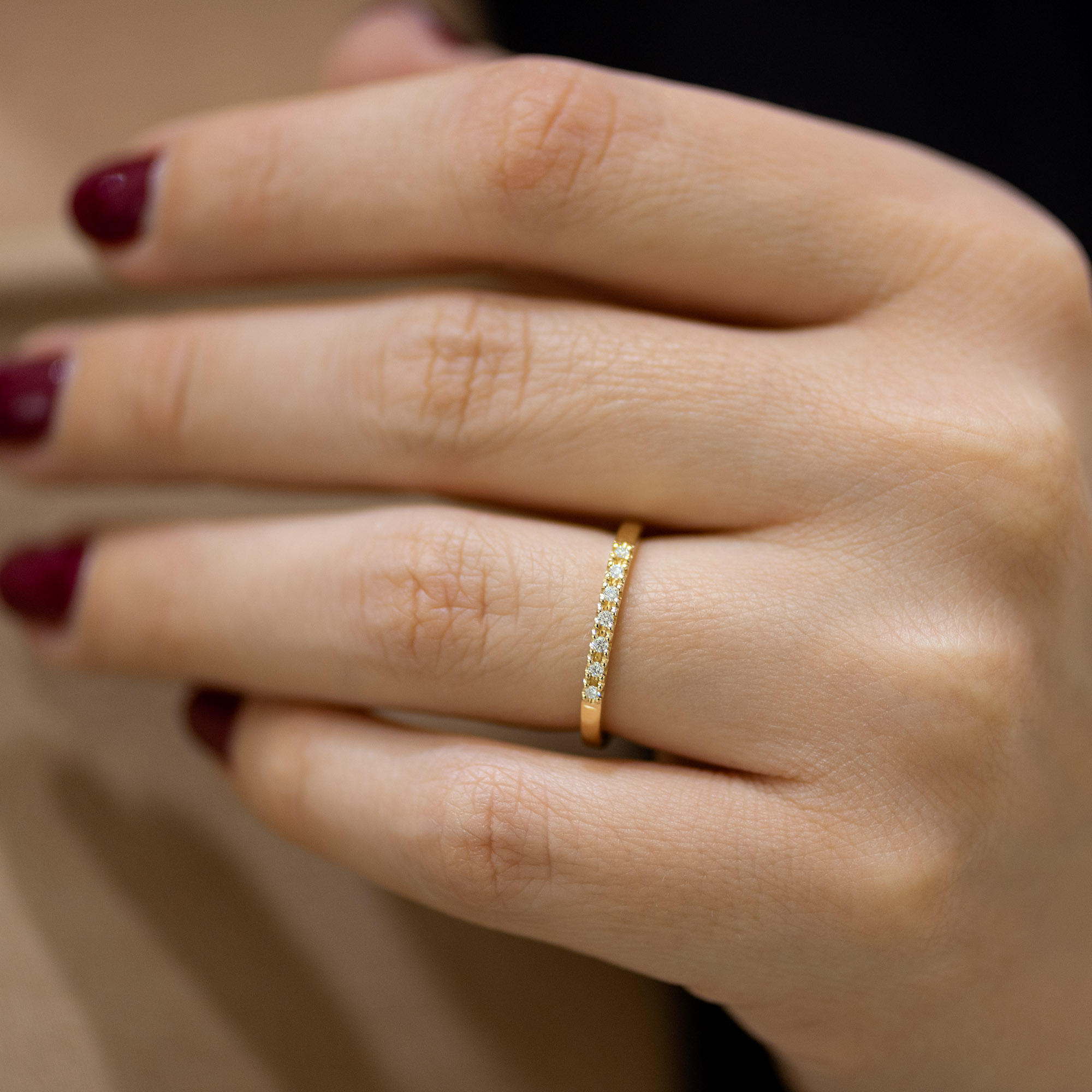 Prsten burma svedenog dizajna ukrašena sa sedam dijamanata. Najkvalitetnije zlato i blistavo drago kamenje čine ovu prsten burmu izuzetnom, dok joj jednostavan dizajn pruža savršenu mogućnost kombinovanja sa drugim prstenjem. Sedam dijamanata kreativno je ufasovano bez velikih držača, što prsten čini još udobnijim za nošenje. Prstenje zlatare Andrejević može biti izrađeno u bilo kojoj od 3 boje zlata: beloj, roze, ili žutoj. Uz to, u zlatari Andrejević, nudimo Vam mogućnost da sami izaberete karatažu, čistoću i boju dijamanata kako biste bili sigurni da će izabrani prsten biti upravo onakav kakav ste želeli.