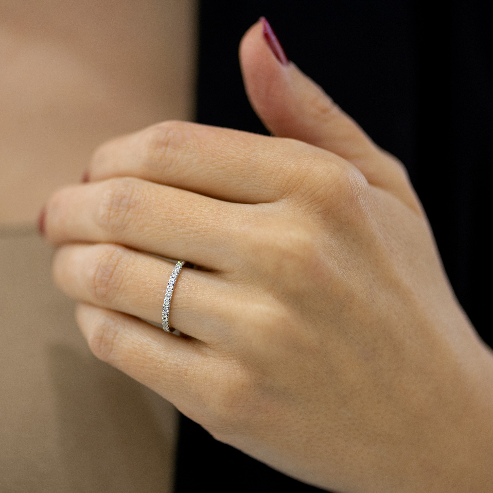Prsten burma sa brilijantima koji se nižu jedan do drugog čineći pun krug. Možete ga nositi kao prsten samostalno, uz verenički prsten i burmu ili kao burmu uz verenički prsten. Mnogo mogućnosti pruža ovaj nežan, moderan i iskričav model prstena.