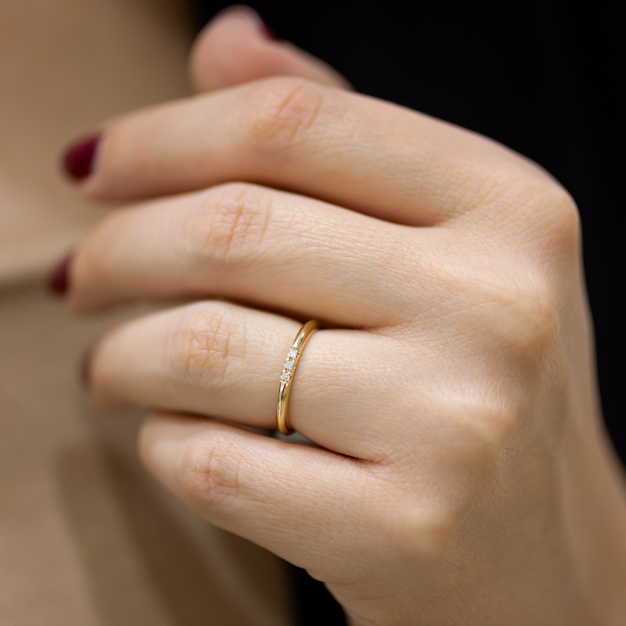 Prsten burma svedenog dizajna i oblih ivica ukrašena sa tri dijamanta. Najkvalitetnije zlato i blistavo drago kamenje odličnih svetlosnih karakteristika čine ovu prsten burmu izuzetnom, dok joj jednostavan dizajn pruža savršenu mogućnost kombinovanja sa drugim prstenjem. Prstenje zlatare Andrejević može biti izrađeno u bilo kojoj od 3 boje zlata: beloj, roze, ili žutoj.