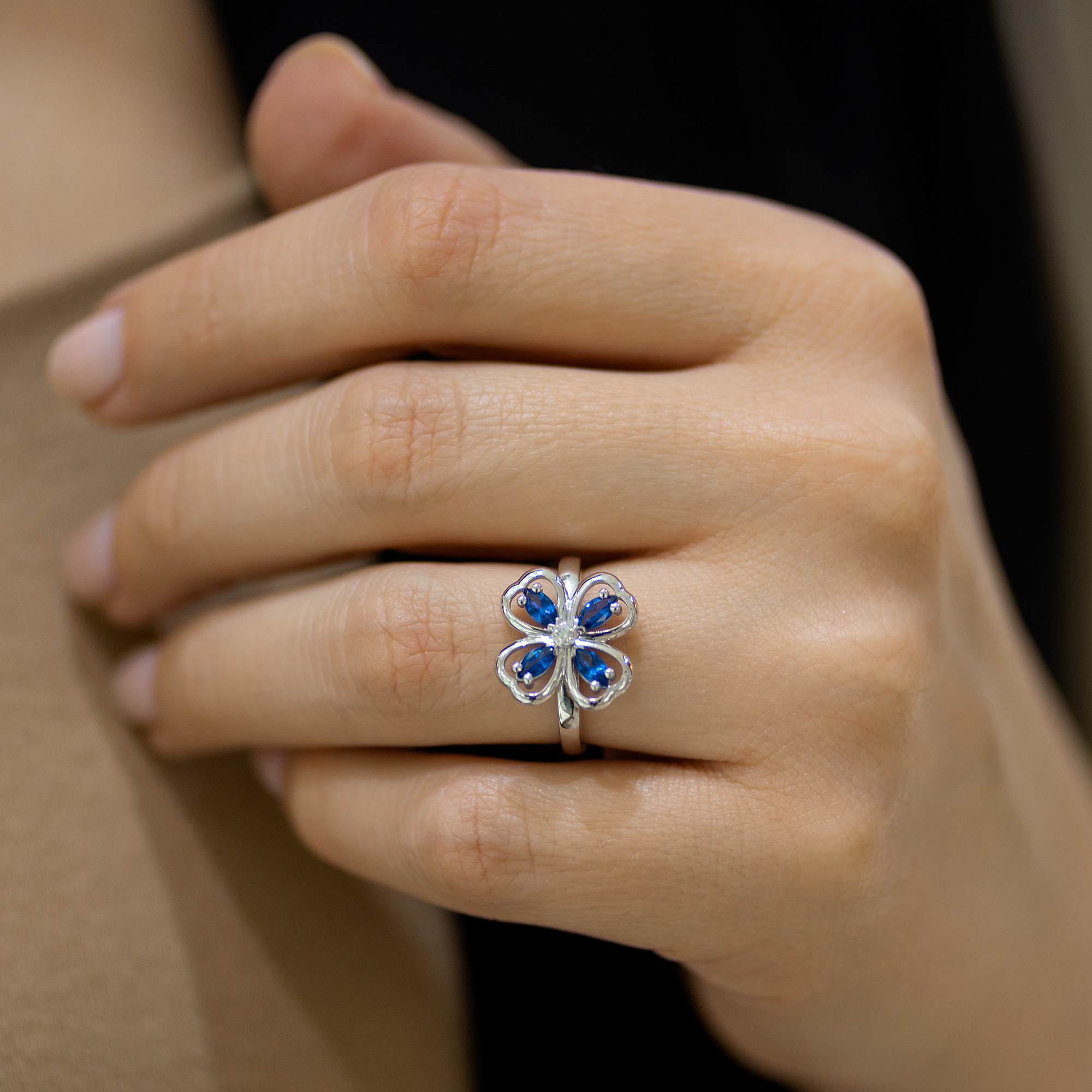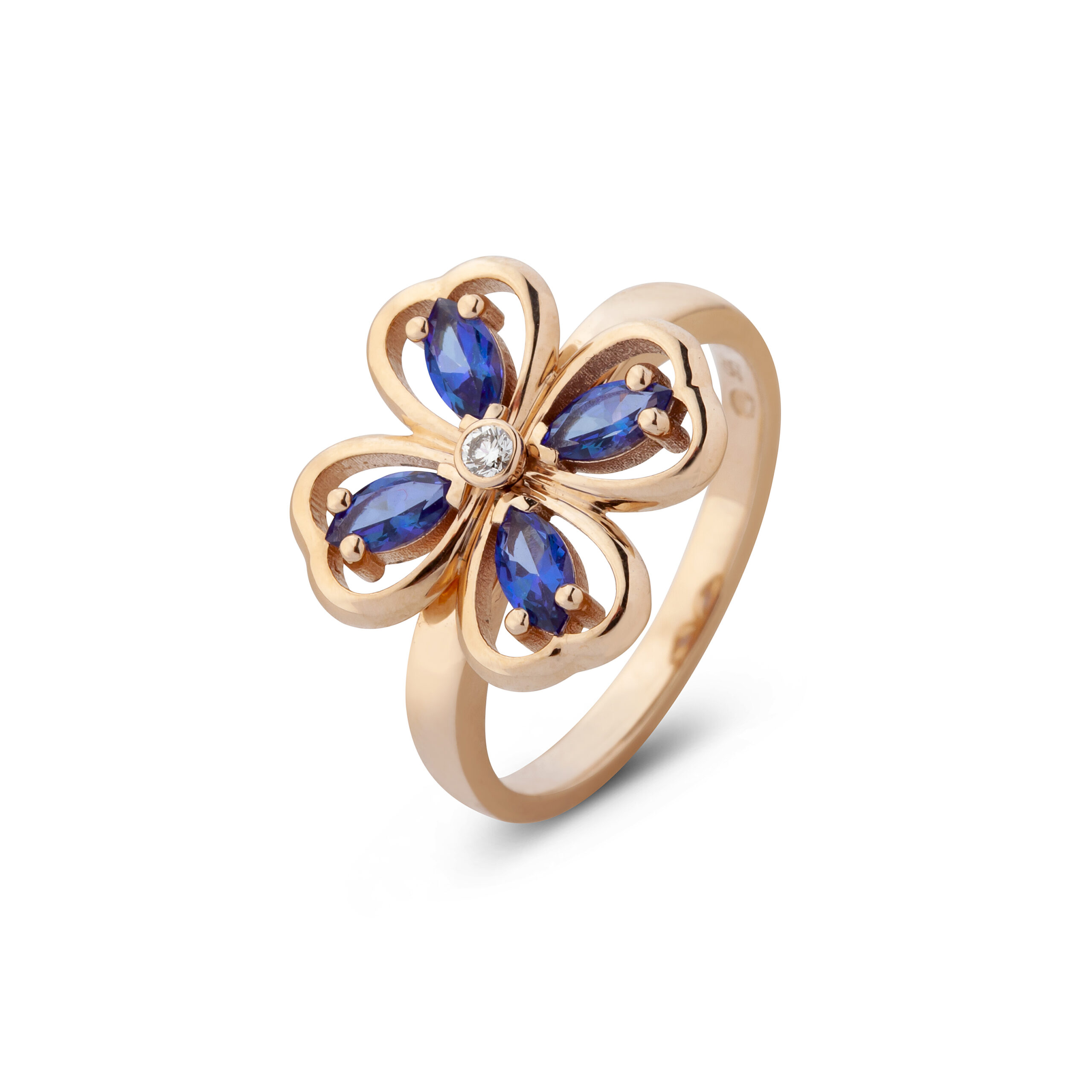 Prsten od zlata u obliku deteline sa četiri lista ukrašen topazima i dijamantom. Na kružnicu od roze zlata smešteni su listovi od belog zlata u koje su ufasovani topazi markiz reza, dok je u sredinu smešten brilijant. Kada je u pitanju naše prstenje, zlatara Andrejević Vam nudi mogućnost da sami izaberete karatažu, čistoću i boju dijamanta, kao i kombinaciju boja zlata, kako biste bili sigurni da će krajnji rezultat biti upravo prsten kakav ste želeli.