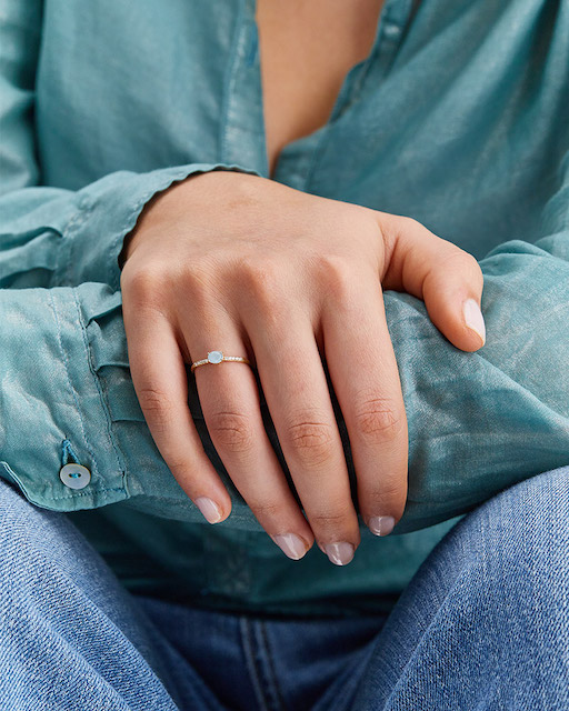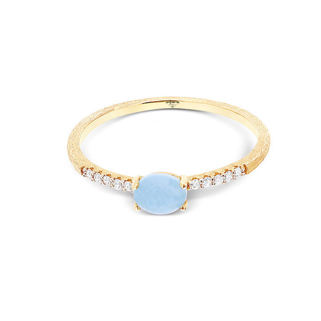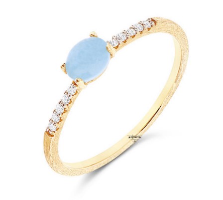Prefinjen Nanis prsten je Vaša doza lagane elegancije za svaki dan. Ponesite je uvek sa sobom i kombinujte sa drugim komadima nakite iz Azure kolekcije, italijanskog brenda nakita Nanis. Prsten je napravljen od žutog zlata koje je ručno gravirano posebnom tehnikom. Prstenom dominira ovalni kamen mlečni akvamarin. Na površini šine prstena, s obe strane kamena, utisnuti su sitni dijamanti velike prozirnosti.