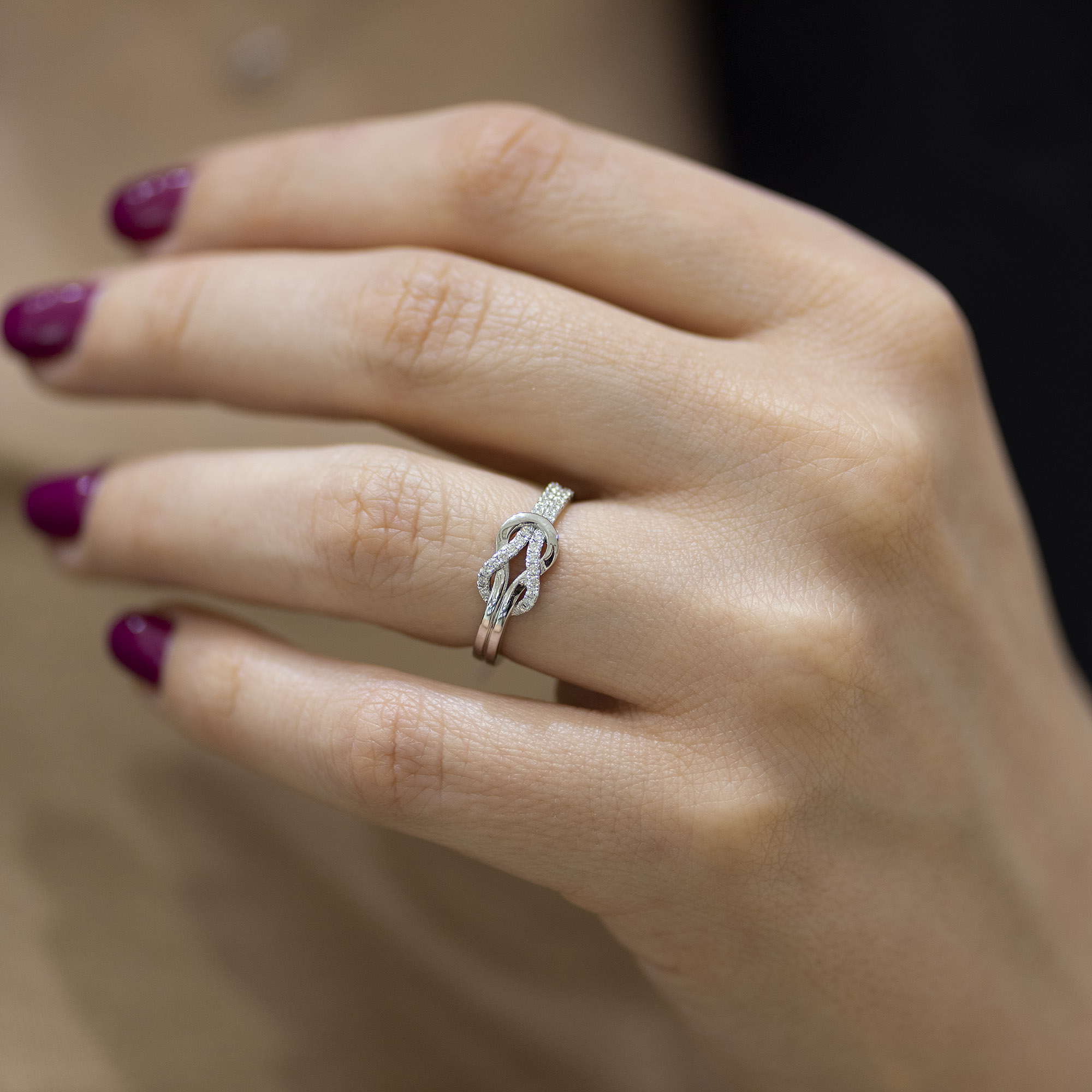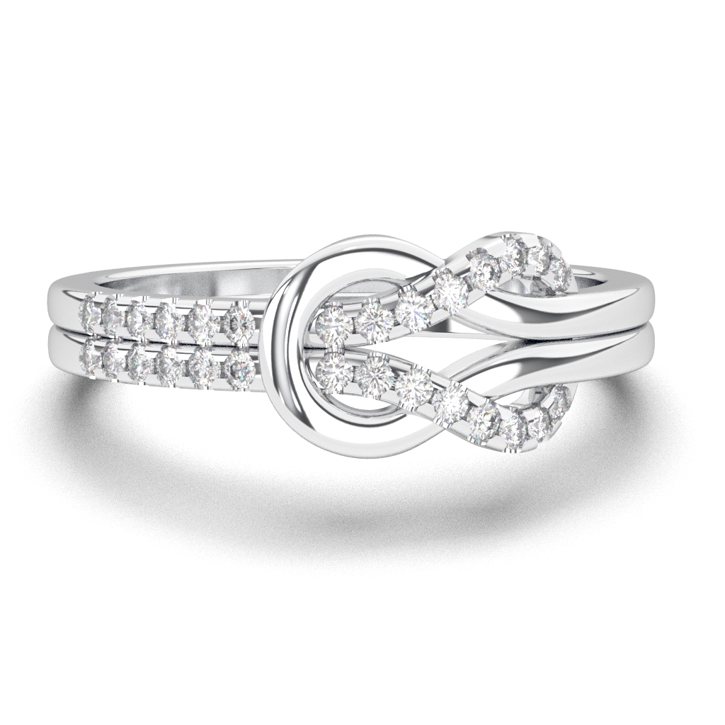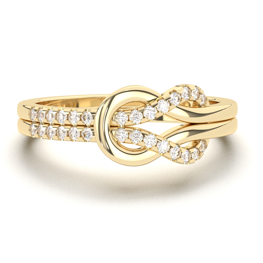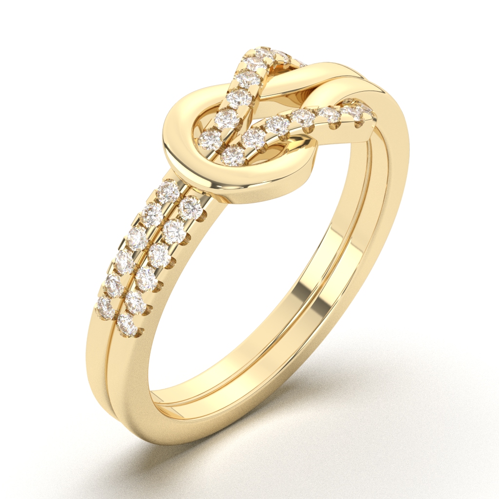 Zlatni prsten neobičnog i modernog dizajna ukrašen dijamantima. Kružnica prstena je kreativno upletena tako da su dva kraja provučena jedan kroz drugi i nalikuju na čvor. Jedan krak je optočen sitnim dijamantima, dok je drugi ispoliran i sjajan. Sam prsten može biti napravljen od belog, roze ili žutog zlata. U zlatari Andrejević Vam nudimo mogućnost da birate veličinu i sve ostale karakteristike dijamanta, kao i karatažu zlata, kako biste bili sigurni da će krajnji rezultat biti upravo dijamantski prsten kakav ste želeli.