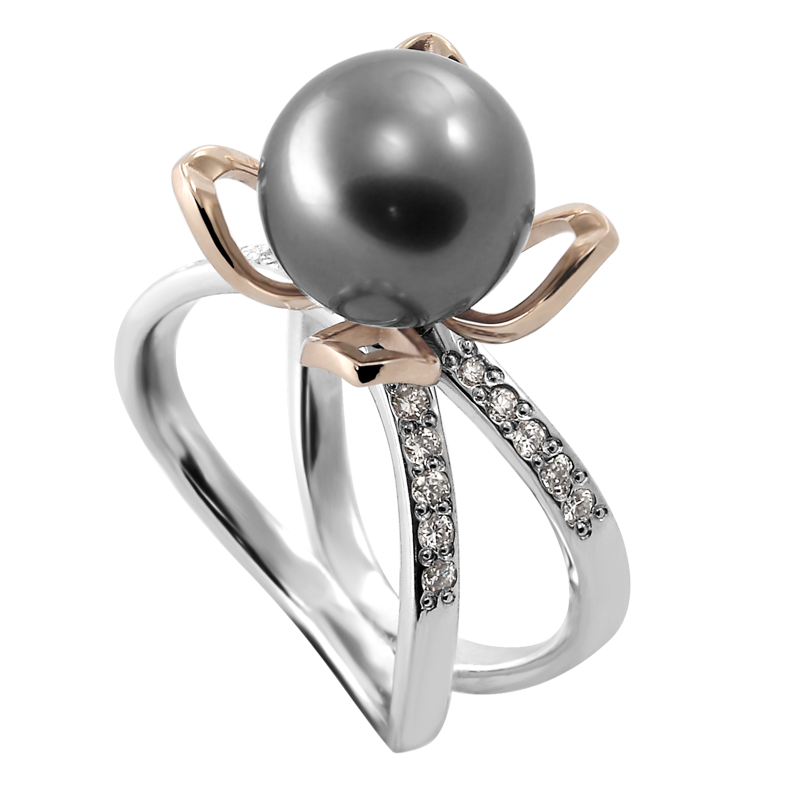 Prsten unikatnog dizajna.Izrađen od dve boje zlata, i ukrašen tamno sivim morskim biserom i brilijantima. Poklon koji sasvim sigurno ostavlja bez daha.