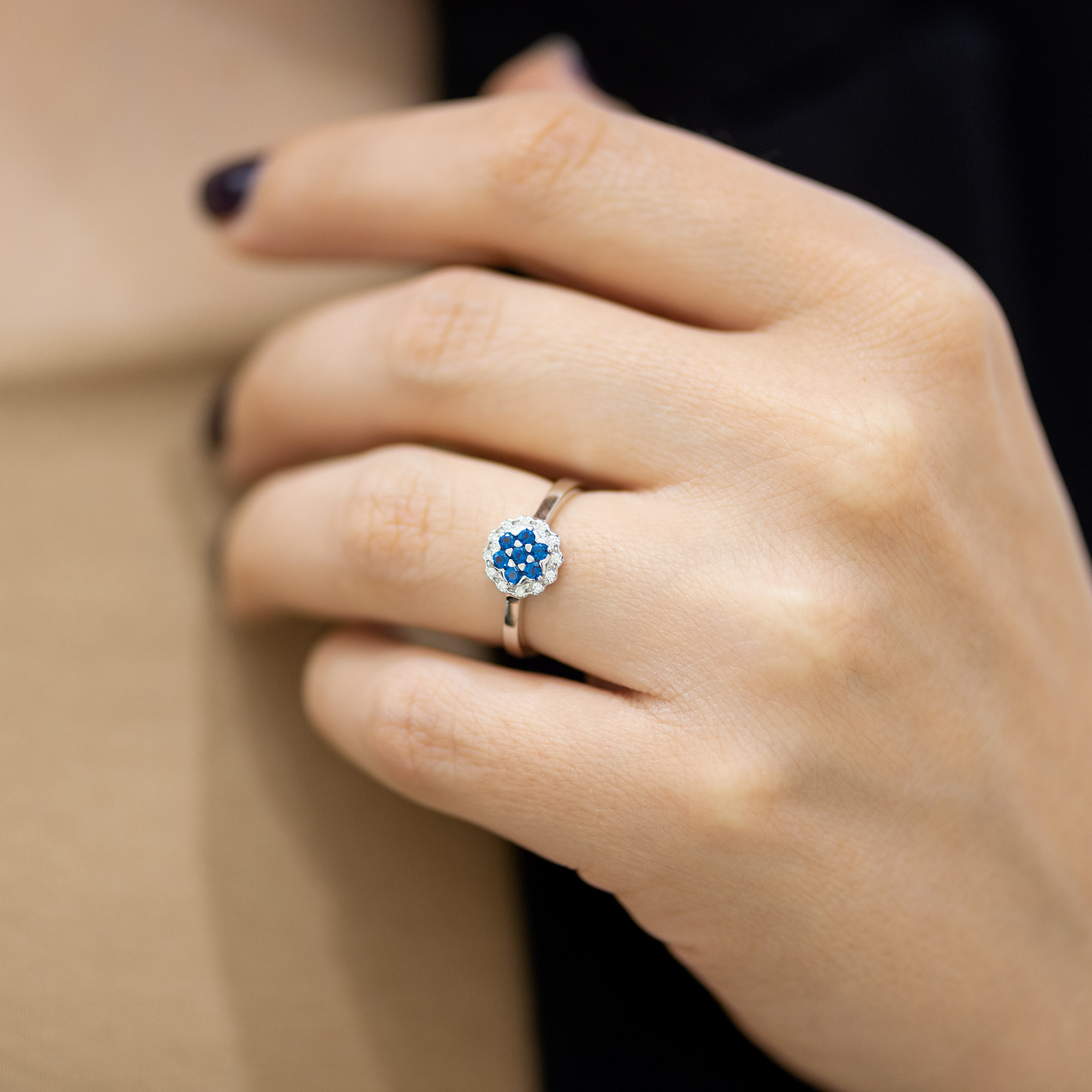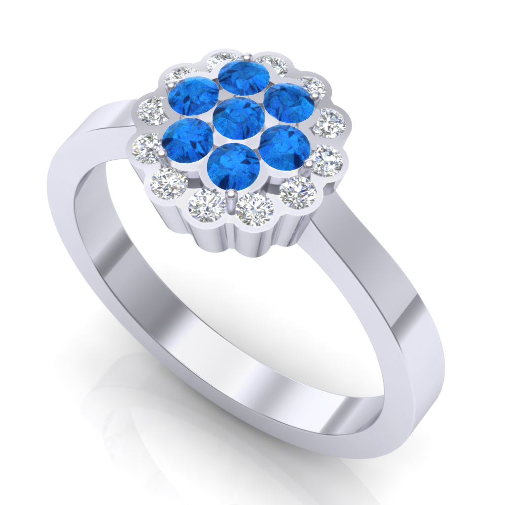 Brilijanti i plavi topazi kreiraju cvetnu formu na prstenu od belog zlata. Lako postaje verenički ukoliko buduća mlada voli autentične komade nakita. Zanimljiv dizajn i preciznu izradu potpisuje zlatara Andrejević.