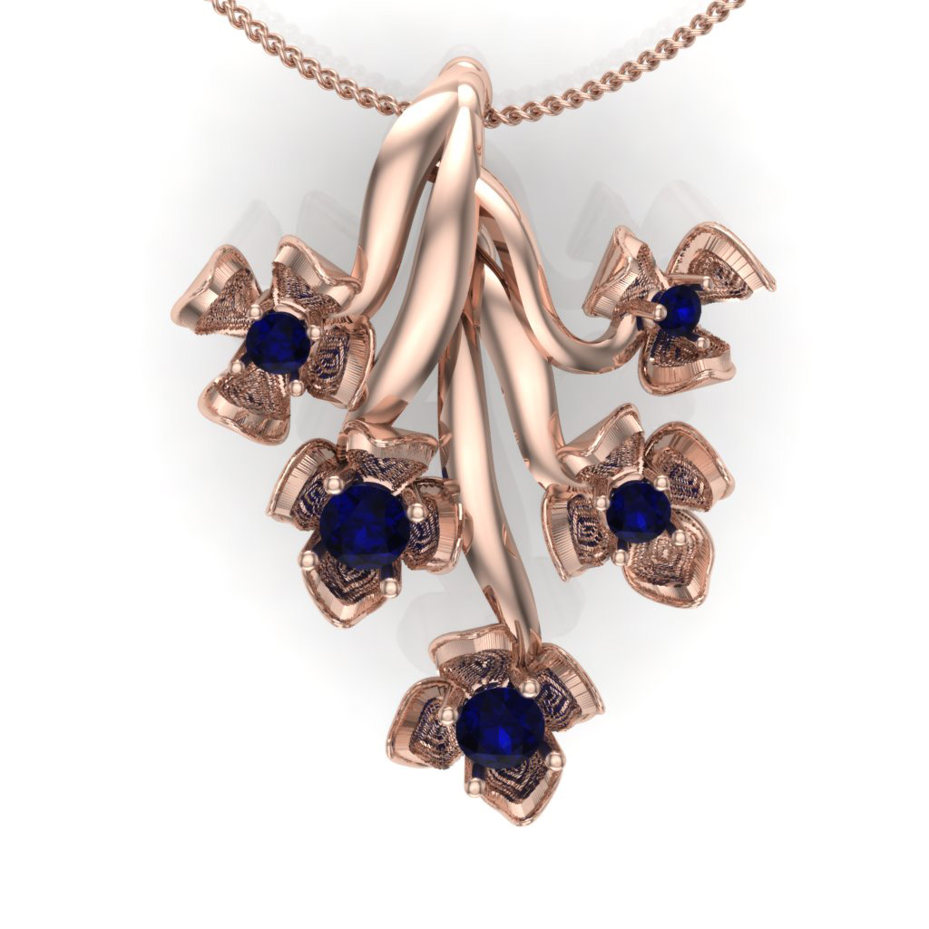 Privezak od zlata u obliku buketića cveća koji krase topazi i brilijanti. Ovaj zlatni privezak nema klasičnu alku, već lančić prolazi direktno kroz privezak, čineći ga tako primetnijim na vratu. Privezak je stilizovan tako da predstavlja pet cvetova u čijem su središtu topazi, a nežne zlatne stabljike se spajaju na samom dnu tako da oblikuju stilizovanu skrivenu alku. Zlatni privesci zlatare Andrejević mogu biti izrađeni u bilo kojoj od 3 boje zlata: beloj, roze, ili žutoj. Uz to, u zlatari Andrejević, nudimo Vam mogućnost da sami izaberete karatažu, čistoću i boju dijamanata i drugog dragog kamenja kako biste bili sigurni da će privesci biti upravo onakvi kakve ste želeli.
