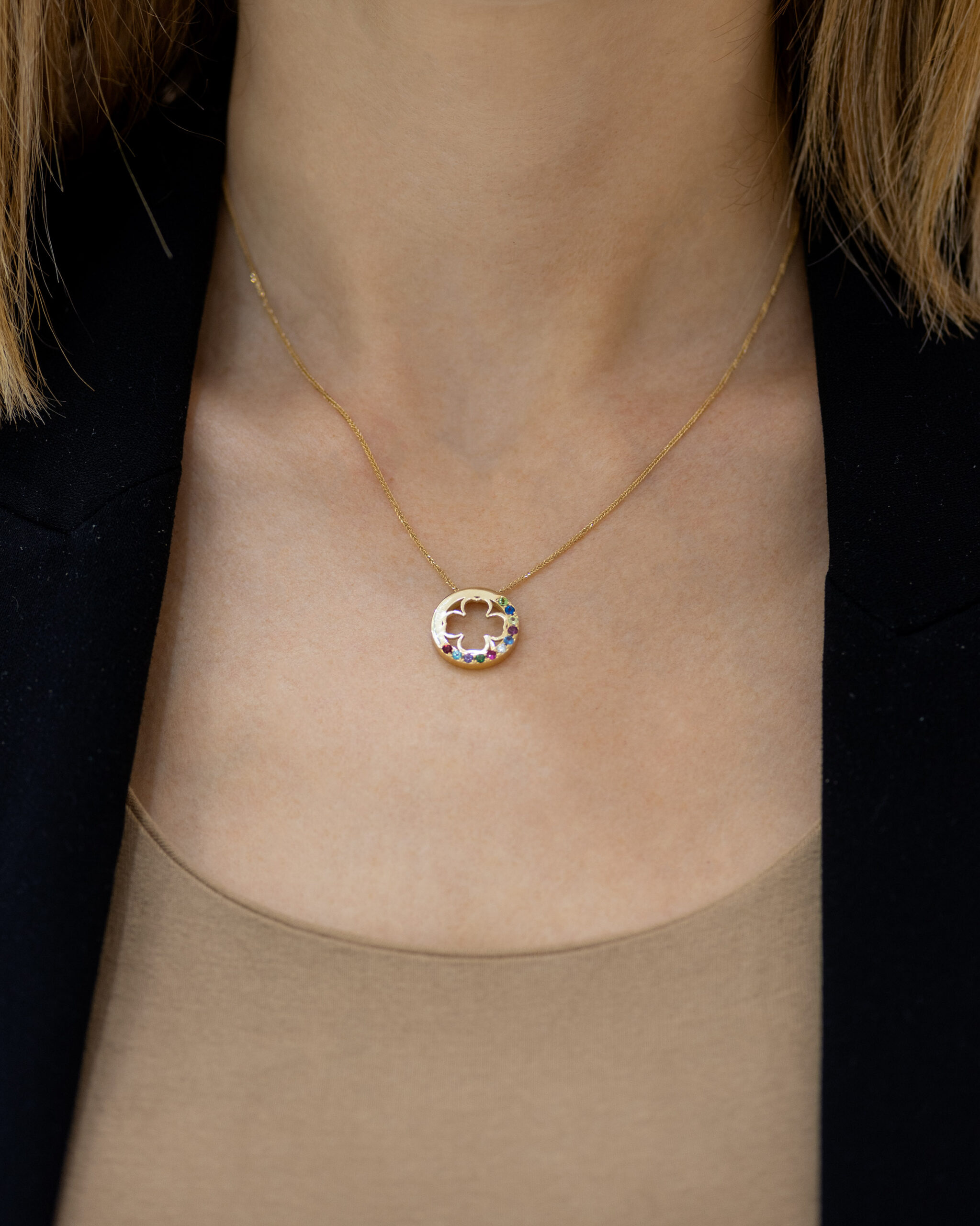 Privezak od zlata u obliku deteline sa četiri lista sa dragim kamenjem. Privesci sa dragim kamenjem su veoma traženi jer njihovo mnoštvo boja dodaje dozu egzotičnosti. Privezak je izrađen od 14-karatnog zlata izuzetnog sjaja i kvaliteta. Zlatni privesci zlatare Andrejević mogu biti izrađeni u bilo kojoj od 3 boje zlata: beloj, roze, ili žutoj. Uz to, u zlatari Andrejević, nudimo Vam mogućnost da sami izaberete karatažu, čistoću i boju dijamanta kako biste bili sigurni da će privesci biti upravo onakvi kakve ste želeli.