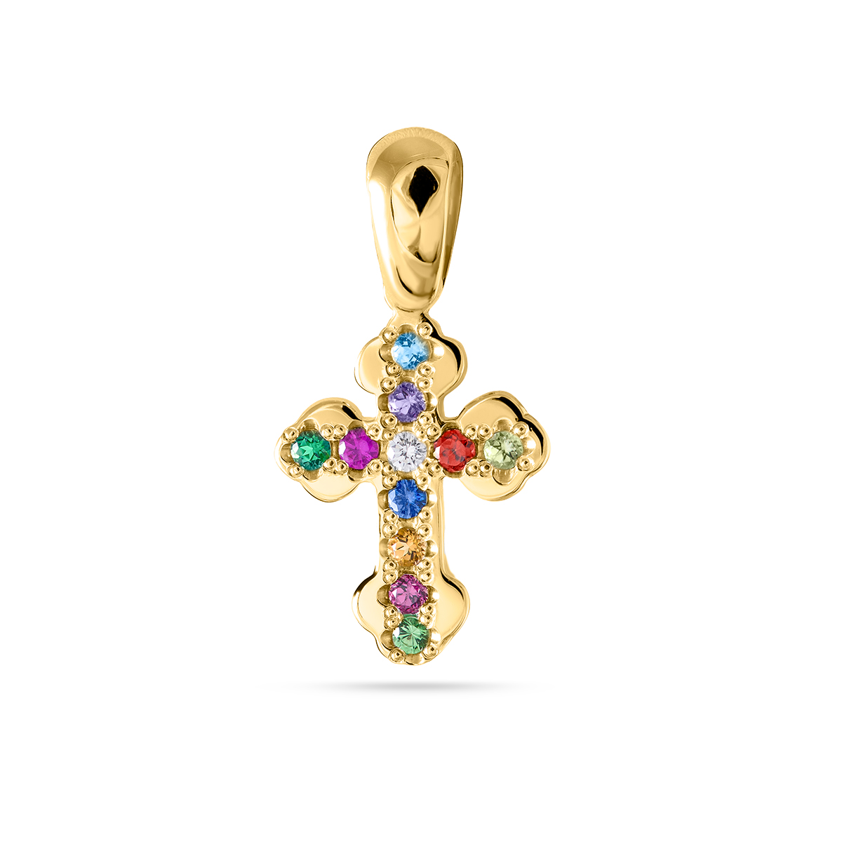 Privezak od zlata u obliku pravoslavnog krsta koji krasi 11 raznobojnih dragulja. Izrađen je od zlata najvećeg kvaliteta i ima klasičnu alku, a na samoj sredini nalazi se jedan blistavi brilijant izuzetnog sjaja. Zlatni privesci zlatare Andrejević mogu biti izrađeni u bilo kojoj od 3 boje zlata: beloj, roze, ili žutoj. Uz to, u zlatari Andrejević, nudimo Vam mogućnost da sami izaberete karatažu, čistoću i boju dijamanta kako biste bili sigurni da će privesci biti upravo onakvi kakve ste želeli.