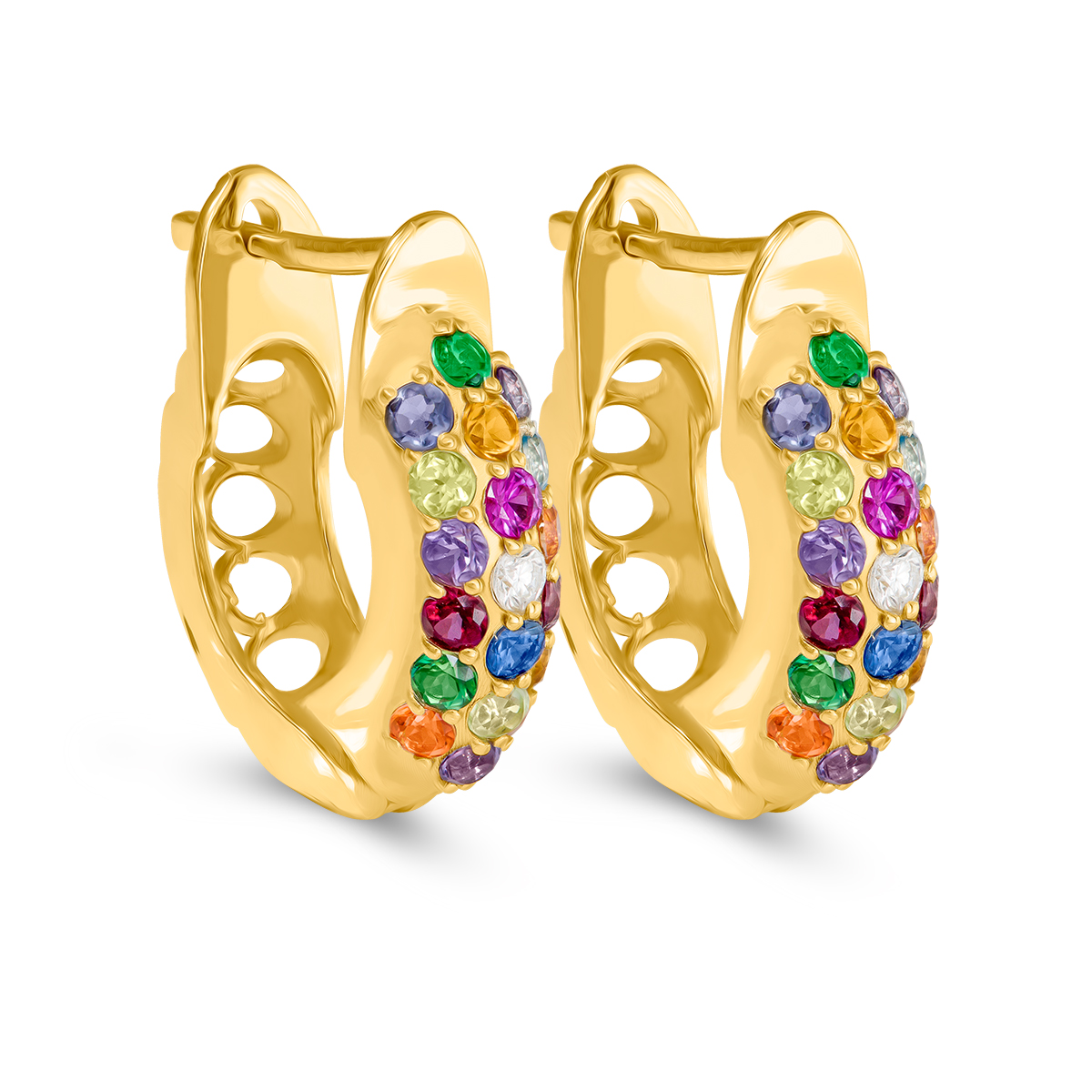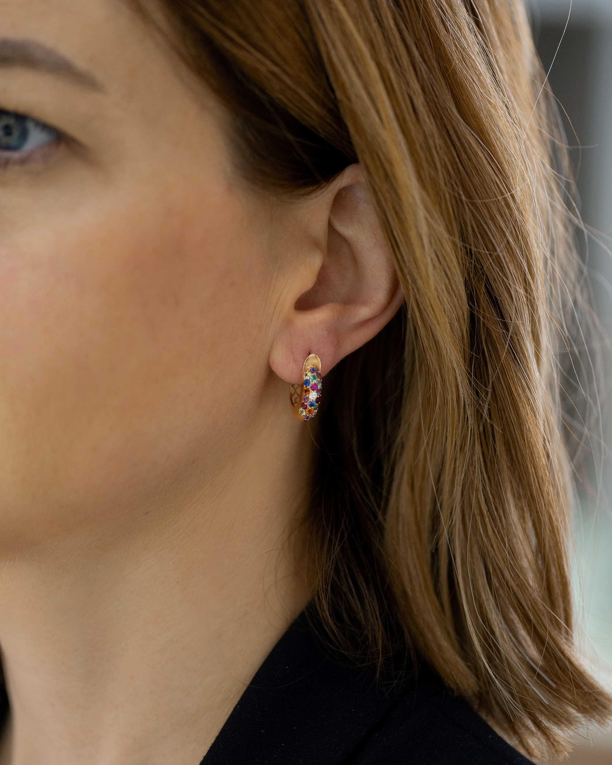Minđuše alke iz kolekcije Tutti Frutti, nesvakidašnjeg oblika, manjih dimenzija i ukrašene dragim kamenjem. U svaku alkicu ufasovano je po 16 dragih kamenova različite boje, što ove zlatne minđuše čini posebno blistavim i raskošnim, a druga strana alkica izgleda kao fino izbrušena zlatna mreža. Sigurna engleska kopča se zbog svog neprimetnog mehanizma savršeno uklapa sa ovim damskim minđušama. U zlatari Andrejević, nudimo Vam mogućnost da sami izaberete karatažu, čistoću i boju dijamanata, kao i boju zlata, kako biste bili sigurni da će krajnji rezultat biti upravo minđuše kakve ste želeli.