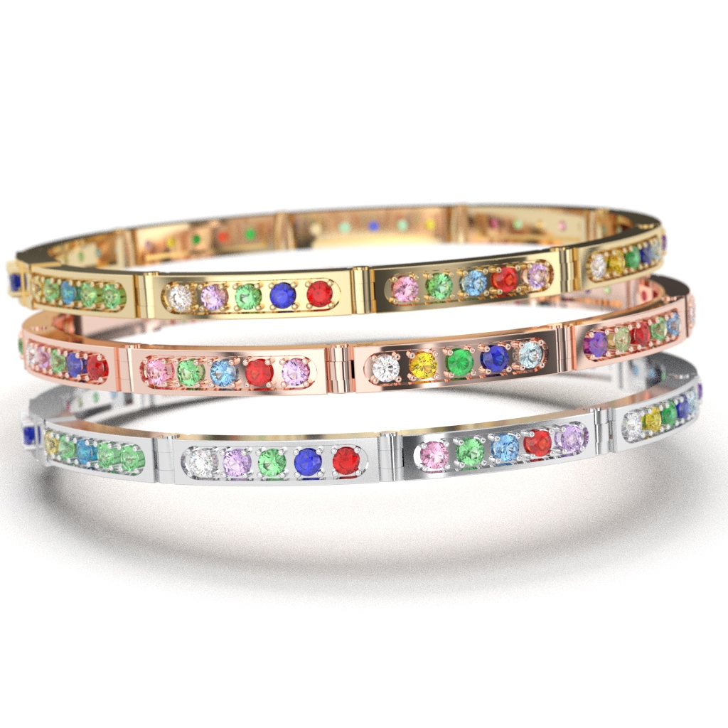 Narukvica od zlata optočena raznobojnim dragim kamenjem iz naše čuvene kolekcije Tutti Frutti. Ova zlatna narukvica sastoji se od čvrstih pločica manjih dimenzija u koje su ufasovani dragulji, a ima i skrivenu sigurnosnu kopču. U zlatari Andrejević, nudimo Vam mogućnost da sami izaberete karatažu, čistoću i boju dijamanata, kao i boju zlata, kako biste bili sigurni da će krajnji rezultat biti upravo narukvice kakve ste želeli.