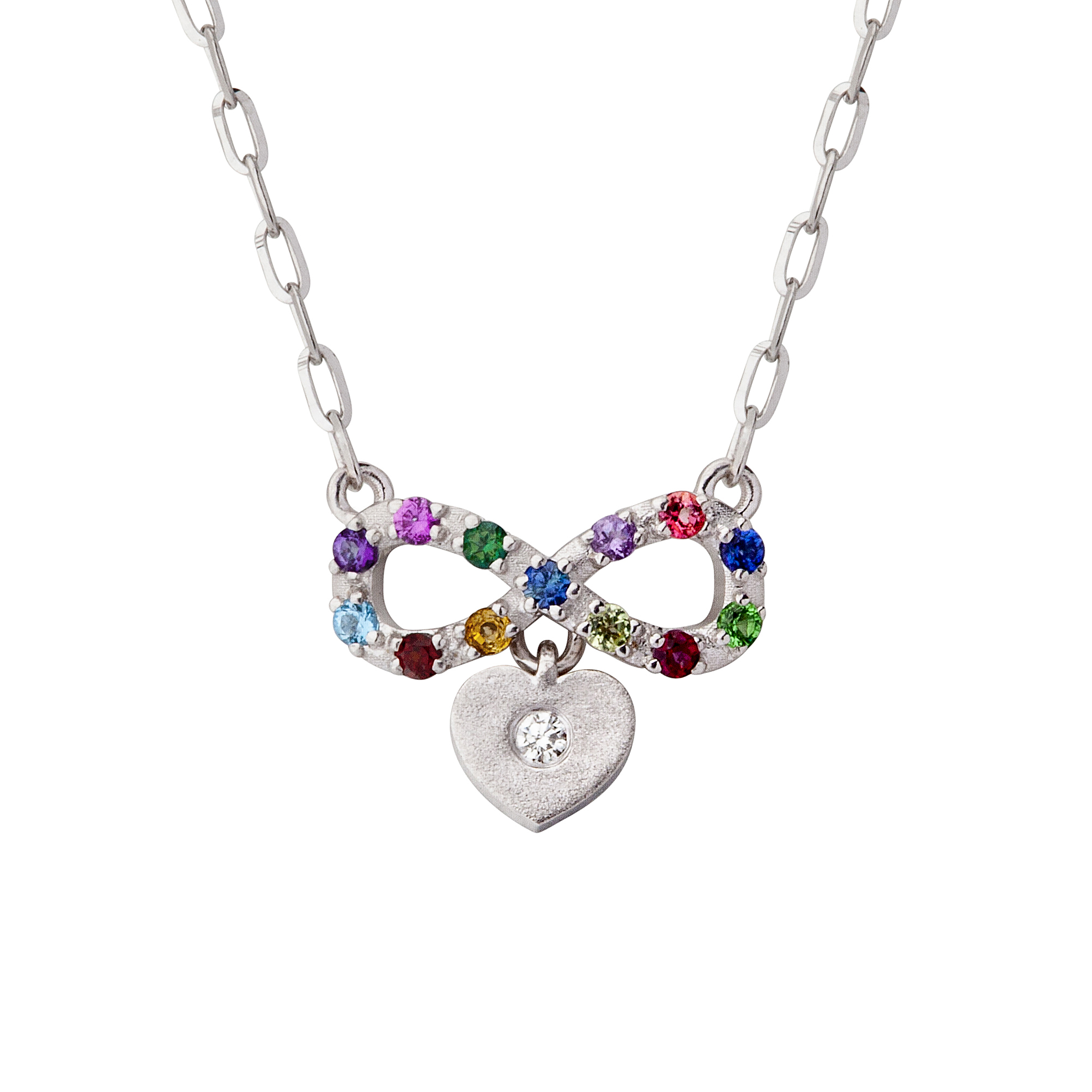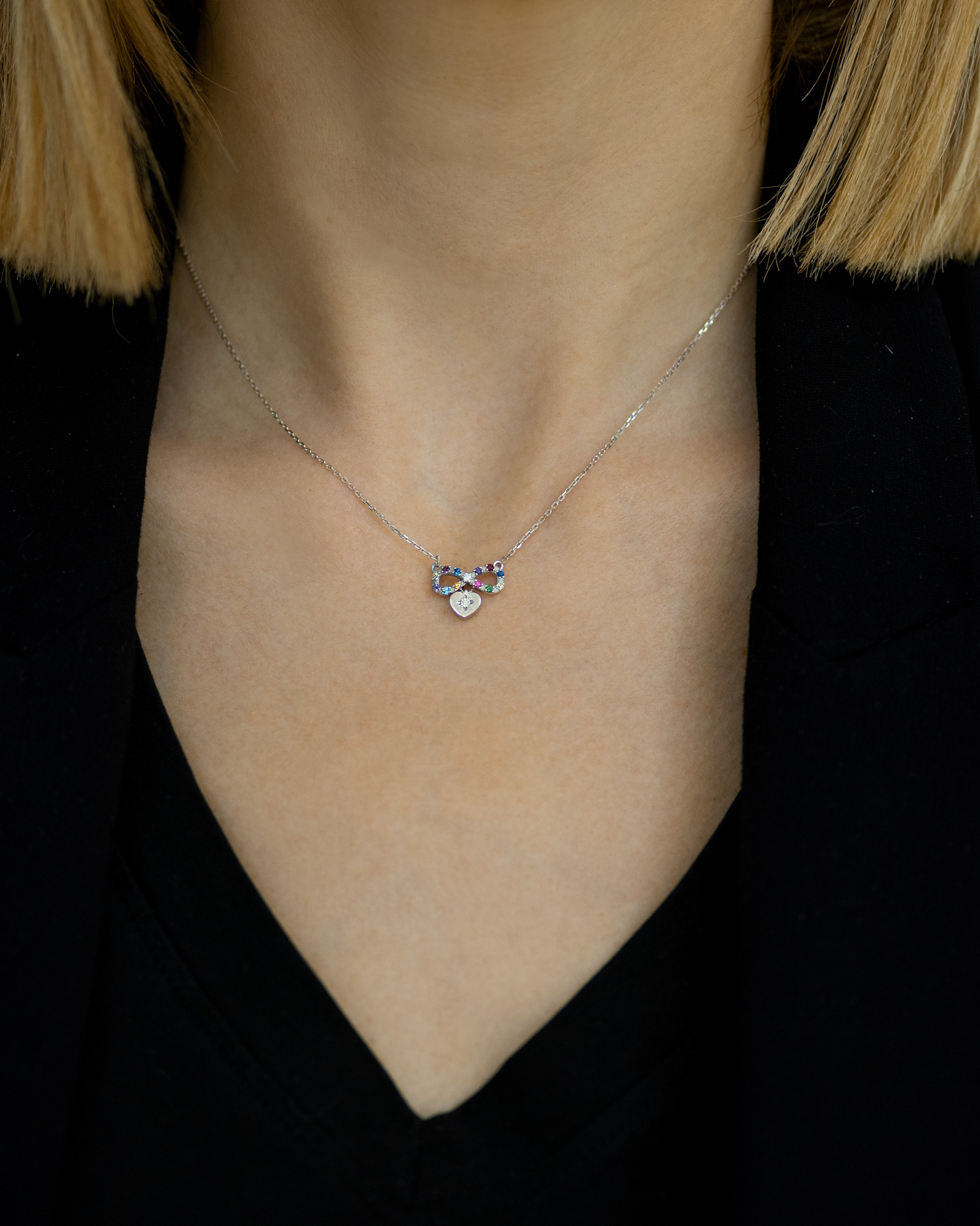 Privezak od zlata iz čuvene Andrejević Tutti Frutti kolekcije koju odlikuje šareno drago kamenje i najlepše zlato. Privezak u obliku simbola beskonačnosti položen je vodoravno i na njega je direktno pričvršćen lančić. Privezak je optočen blistavim dragim kamenjem i na sredini je pričvršćeno malo zlatno srce u čijem središtu se nalazi dijamant. Cena koja je prikazana, odnosi se na privezak, dok lančić možete odabrati prilikom porudžbine ili kupiti sa lančićem, koji se nalazi već pričvršćen na postojećem privesku. Naši zlatni privesci mogu biti izrađene u bilo kojoj od 3 boje zlata: beloj, roze, ili žutoj.