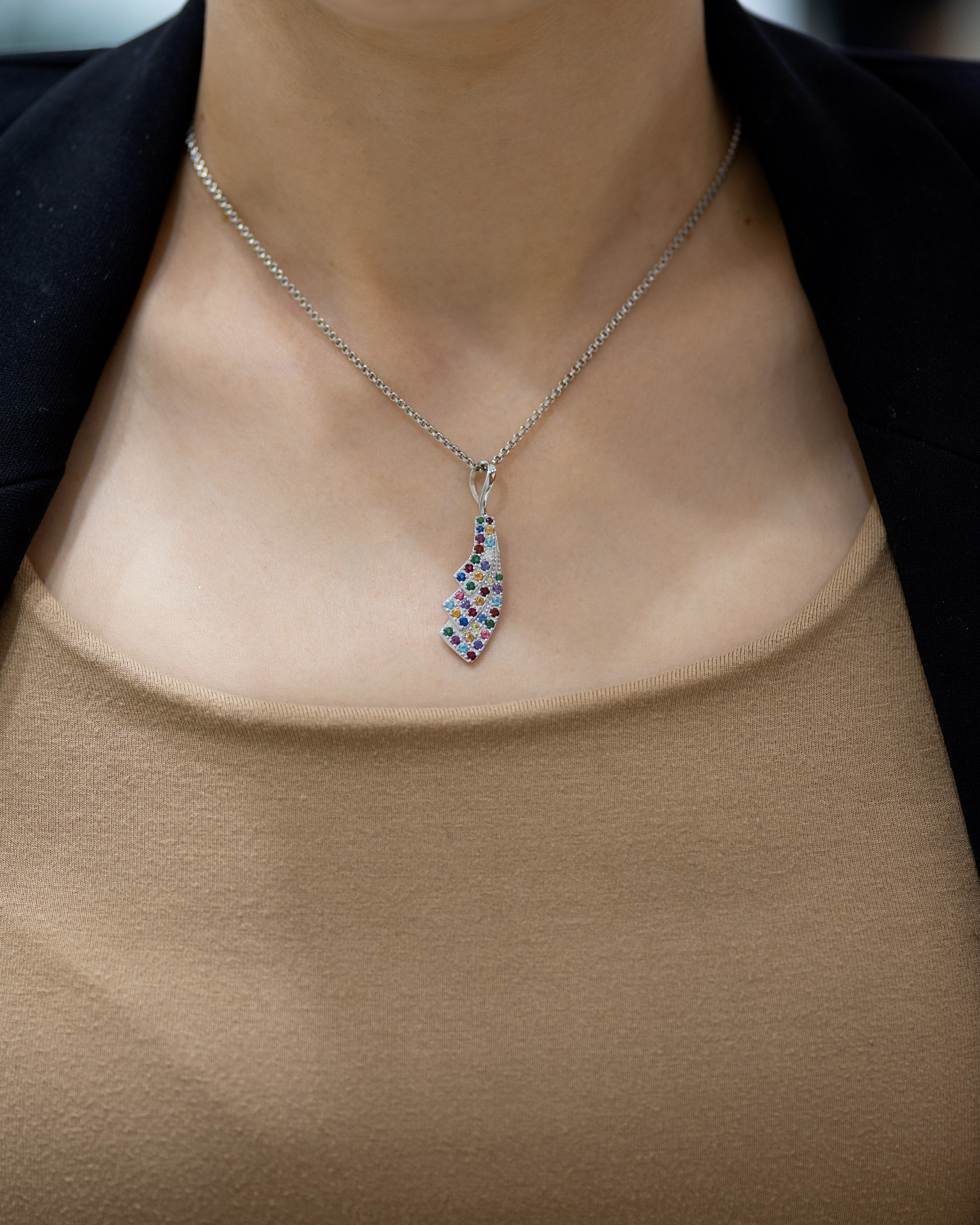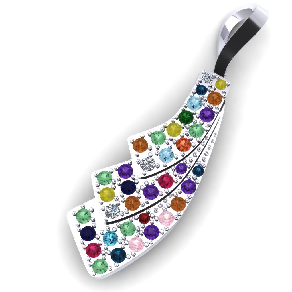Ukoliko Vas privlače komadi nakita neobičnog oblika i šarenih boja, ovaj Tutti Frutti privezak pravi je izbor. Tri lista od zlata složeni su jedan na drugi tako da privezak nalikuje stilizovanom krilu oštrih linija. Šareni dragulji čine ovaj privezak dominantnim i upadljivim. Zlatara Andrejević nudi Vam sigurnu online kupovinu, dostavu na kućnu adresu, kao i mogućnost video prezentacije proizvoda.