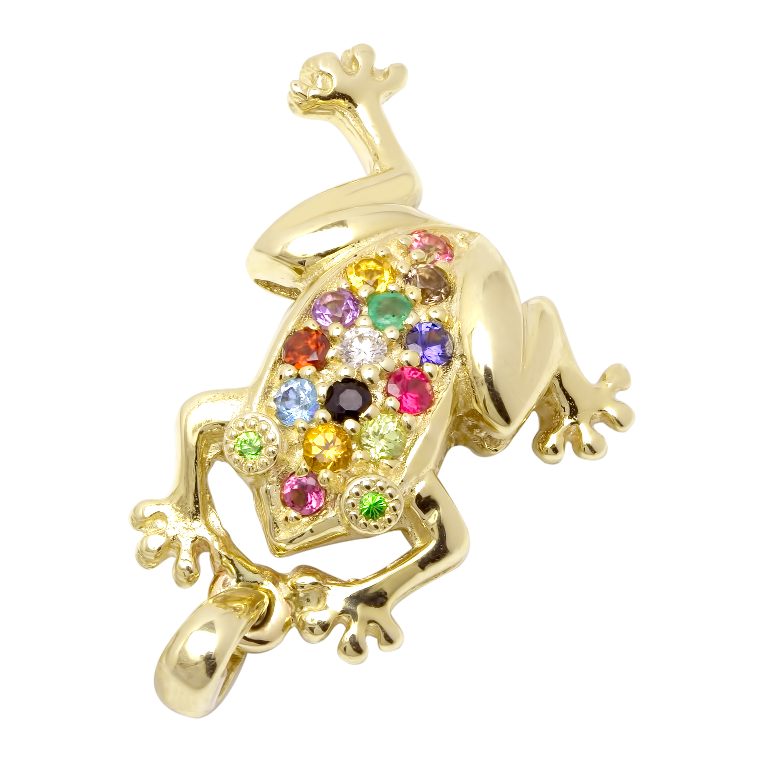 Privezak od zlata iz naše čuvene kolekcije Tutti Frutti u obliku žabe. Privezak je izrađen od najkvalitetnijeg zlata, optočen raznobojnim draguljima i ima klasičnu alku. Zlatni privesci zlatare Andrejević mogu biti izrađeni u bilo kojoj od 3 boje zlata: beloj, roze, ili žutoj. Uz to, u zlatari Andrejević, nudimo Vam mogućnost da sami izaberete karatažu, čistoću i boju dijamanta kako biste bili sigurni da će privesci biti upravo onakvi kakve ste želeli.