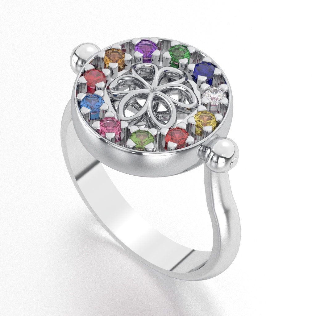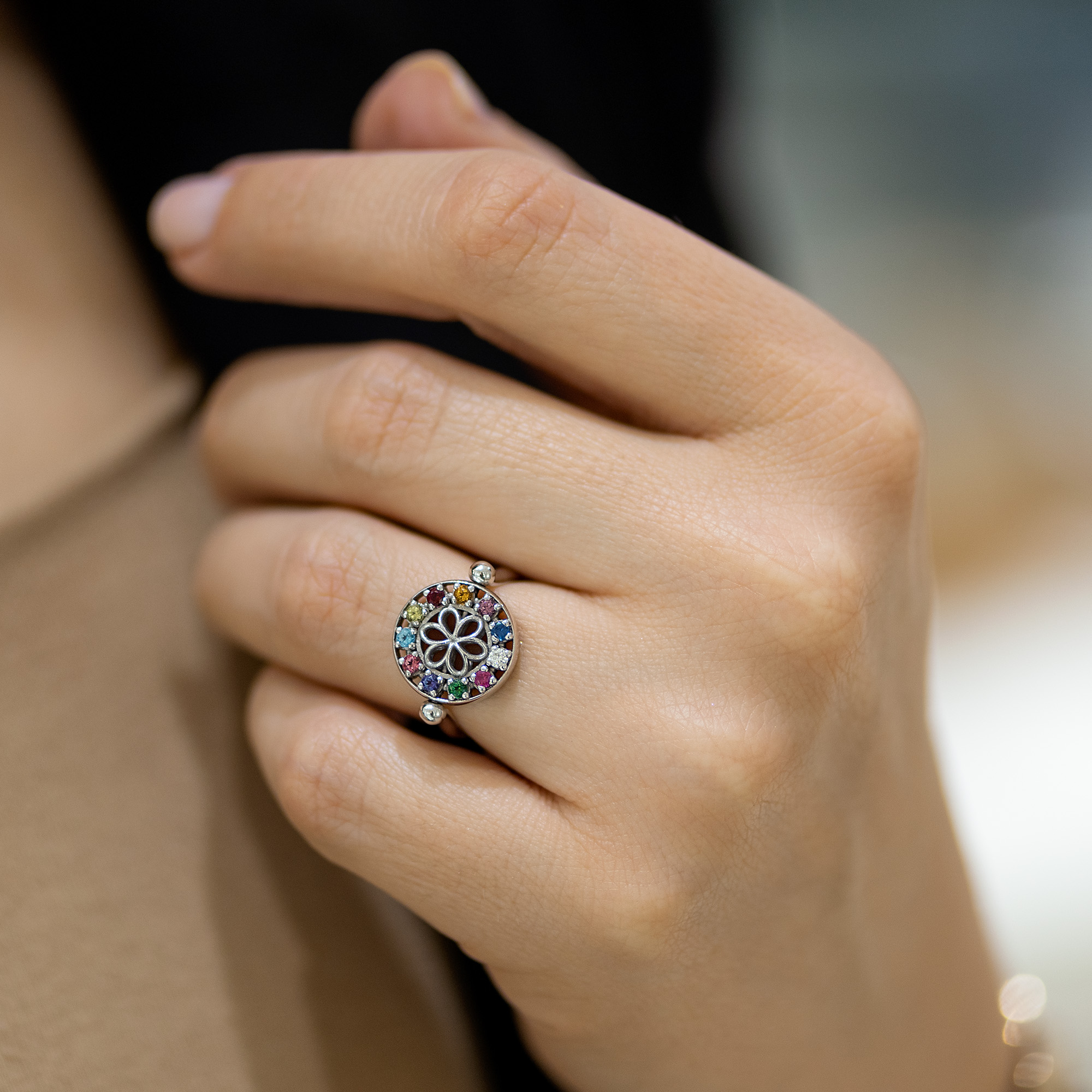 Jedinstven prsten čiji gornji kružni deo se pomera dolazi iz najpopularnije kolekcije zlatare Andrejević. Tutti Frutti iznedrila je prsten uz pomoć kog ćete biti upadljivi uvek i svuda! Kvalitetno zlato u boji koju sami odaberete, zatim drago kamenje takođe u boji po žeji i jedan brilijant čine ovo remek- delo.