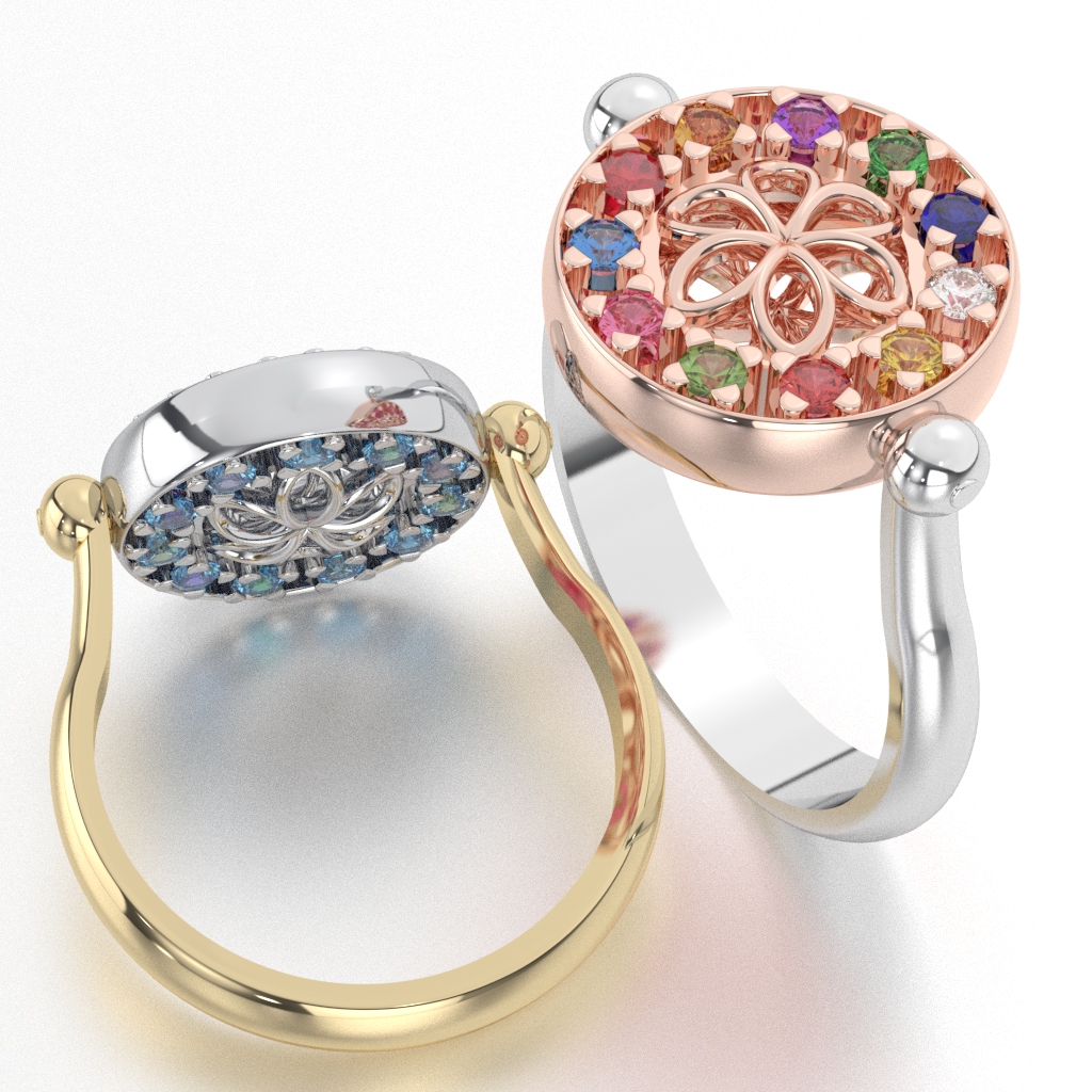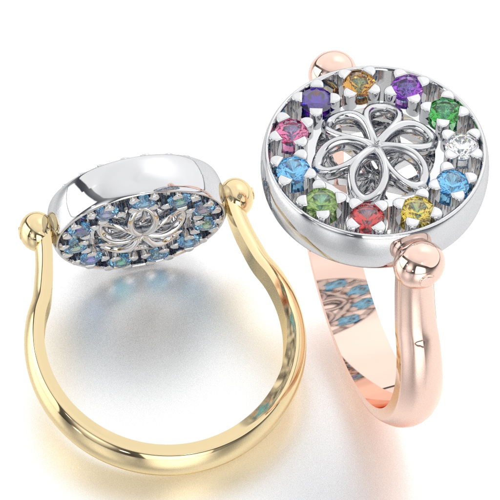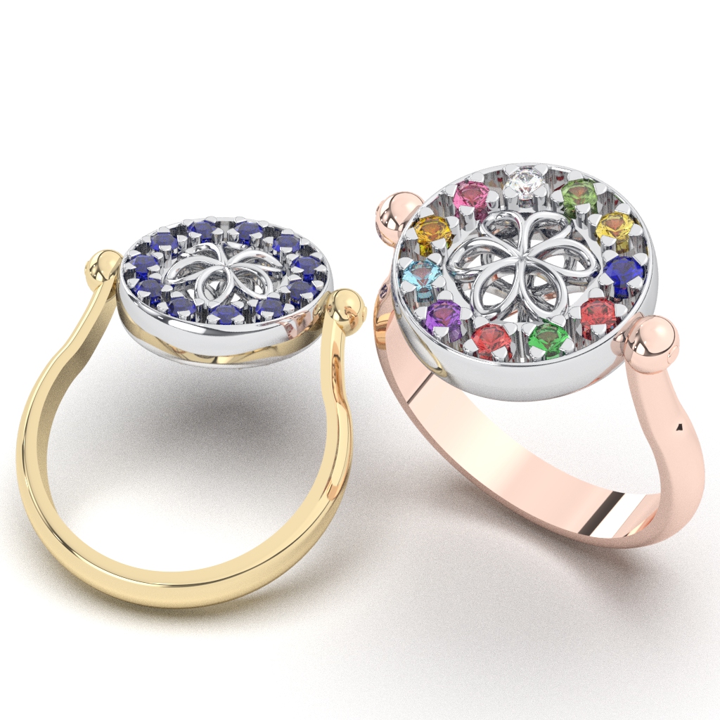 Najbolje od svega je što se sami možete igrati sa materijalima i tako stvoriti sopstvenu čaroliju! Birajte u kojoj boji zlata će biti koji deo prstena (osnova ili pokretni disk) i koje boje prirodnih kamenčića će dominirati. Konfiguracija je jednostavna koliko i online poručivanje, ali i uklapanje ovog prstena u sve kombinacije.
