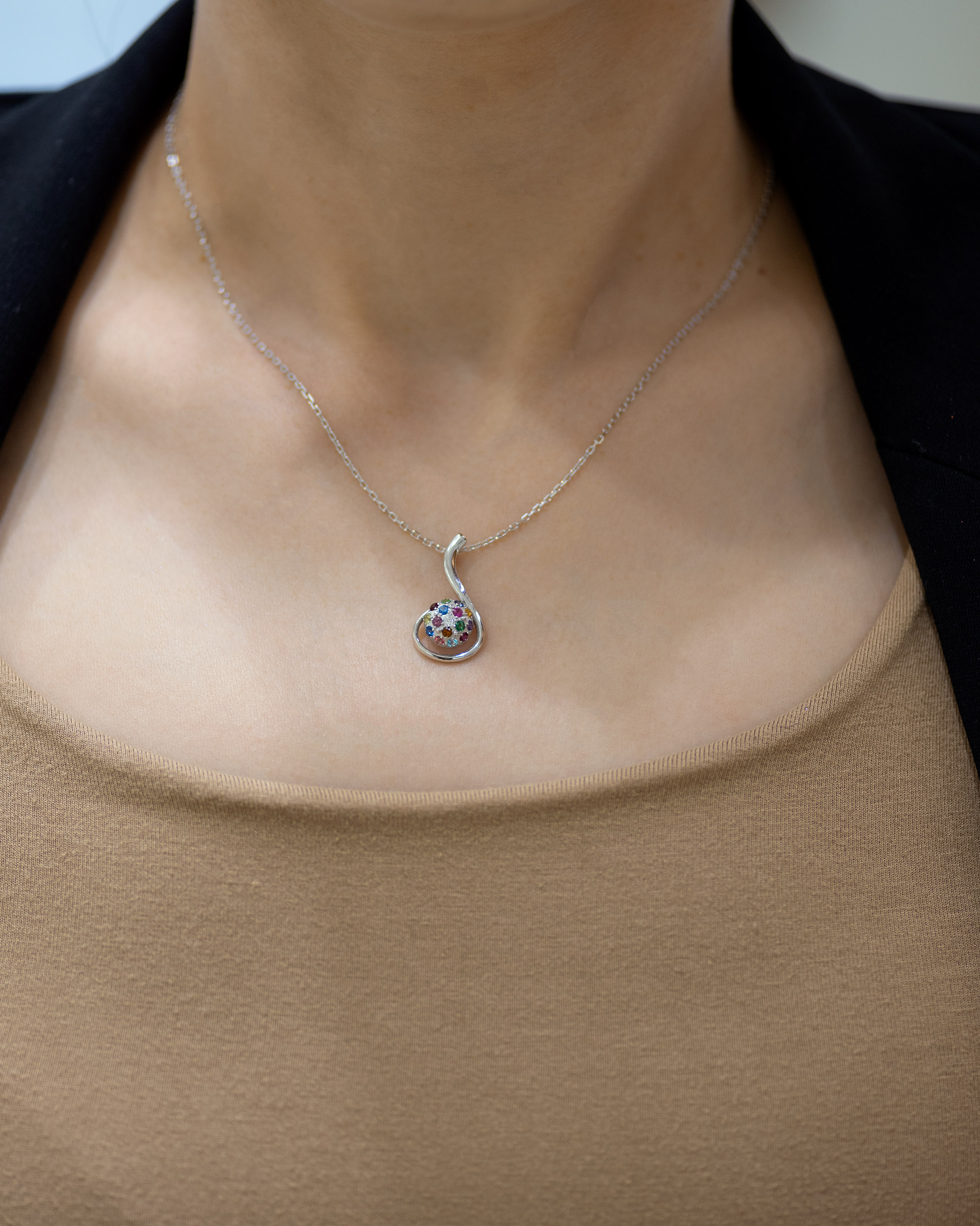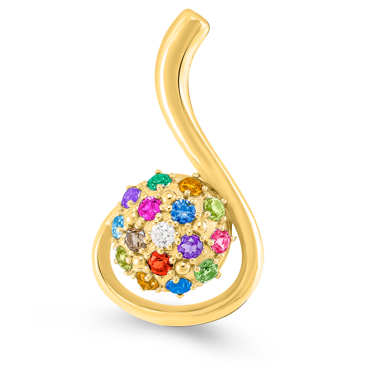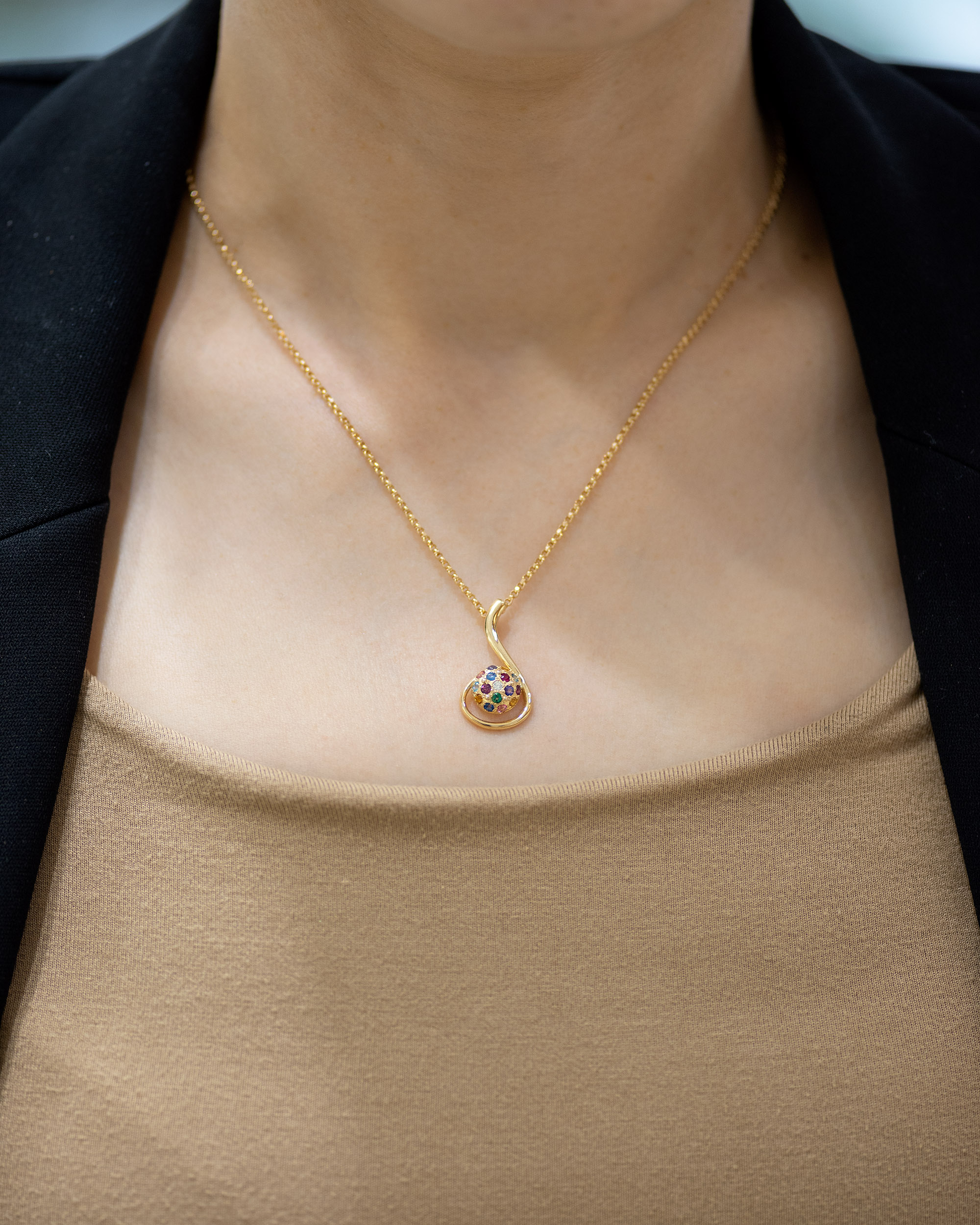 Privezak od zlata iz kolekcije Tutti Frutti neobičnog oblika. Privezak je izrađen od od zlata izuzetnog sjaja i kvaliteta i nema klasičnu alku. Kuglica od zlata u potpunosti je optočena raznobojnim draguljima, dok je duga zlatna grančica uvijena oko nje tako da podseća na oblik note ili neobičnog cveta. Zlatni privesci zlatare Andrejević mogu biti izrađeni u bilo kojoj od 3 boje zlata: beloj, roze, ili žutoj. Uz to, u zlatari Andrejević, nudimo Vam mogućnost da sami izaberete karatažu, čistoću i boju dijamanta kako biste bili sigurni da će privesci biti upravo onakvi kakve ste želeli.