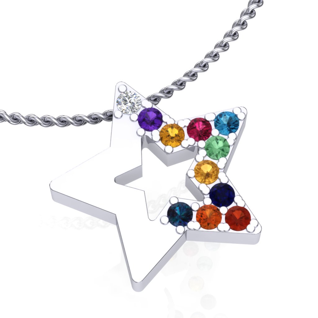 Privezak od zlata u obliku zvezde, ukrašen sa 11 dragulja različite boje.Ovaj Tutti Frutti privezak je napravljen od najkvalitetnijeg 14-karatnog zlata i nema klasičnu alkicu za lančić. Umesto toga, lančić izgleda kao da prolazi kroz sam krak zvezde. Zlatni privesci zlatare Andrejević mogu biti izrađeni u bilo kojoj od 3 boje zlata: beloj, roze, ili žutoj. Uz to, u zlatari Andrejević, nudimo Vam mogućnost da sami izaberete karatažu, čistoću i boju dijamanta kako biste bili sigurni da će privesci biti upravo onakvi kakve ste želeli.
