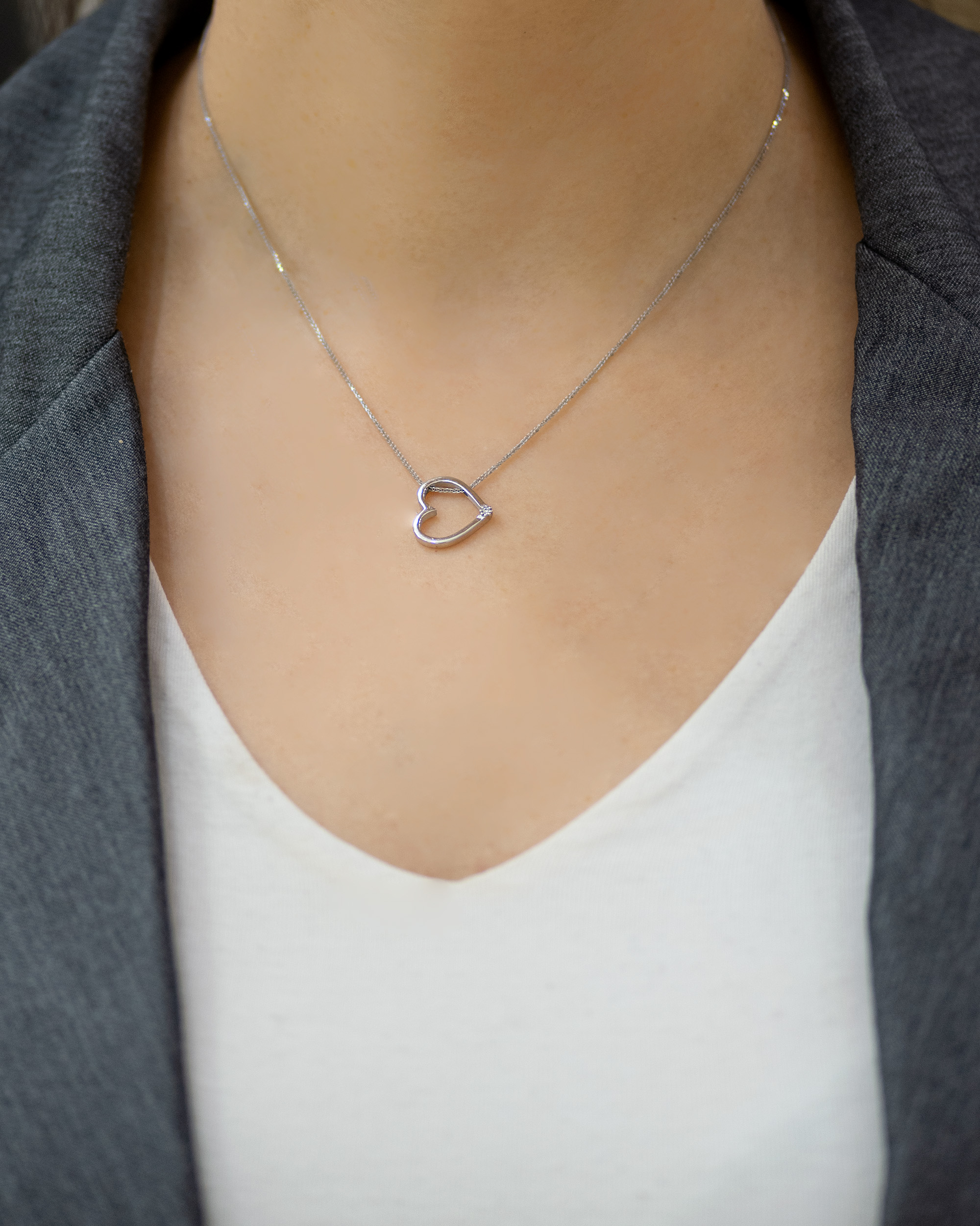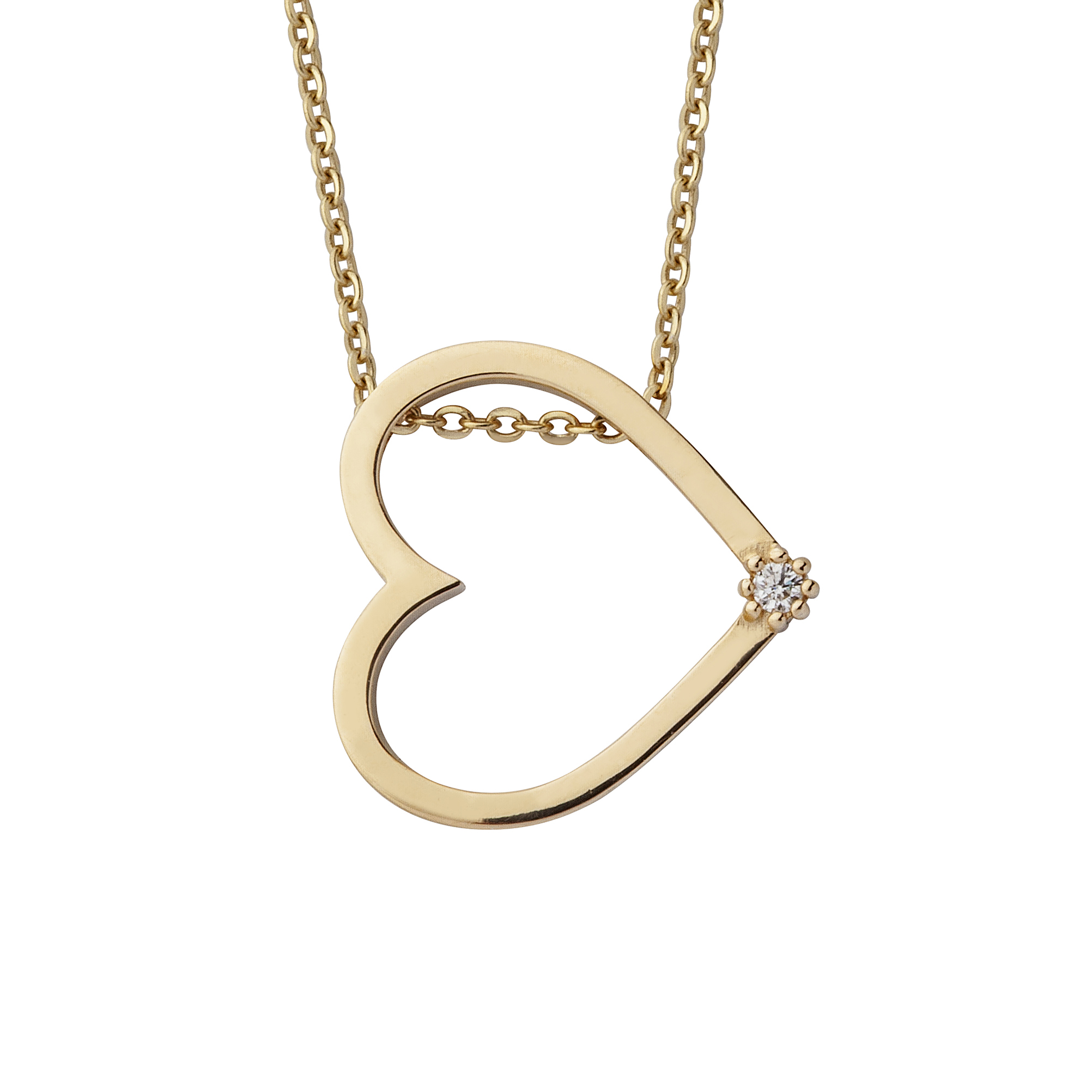 Privezak od zlata u obliku srca koji krasi dijamant. Privezak je većih dimenzija, nema klasičnu alku, i postavljen je vodoravno, tako da se vidi lančić koji prolazi kroz njega. Dijamant postavljen na dno srca se zbog ovakvog položaja priveska, nalazi sa strane. Naši zlatni privesci mogu biti izrađene u bilo kojoj od 3 boje zlata: beloj, roze, ili žutoj. Uz to, u zlatari Andrejević, nudimo Vam mogućnost da sami izaberete karatažu, čistoću i boju dijamanta, kako biste bili sigurni da će privesci biti upravo onakvi kakve ste želeli.