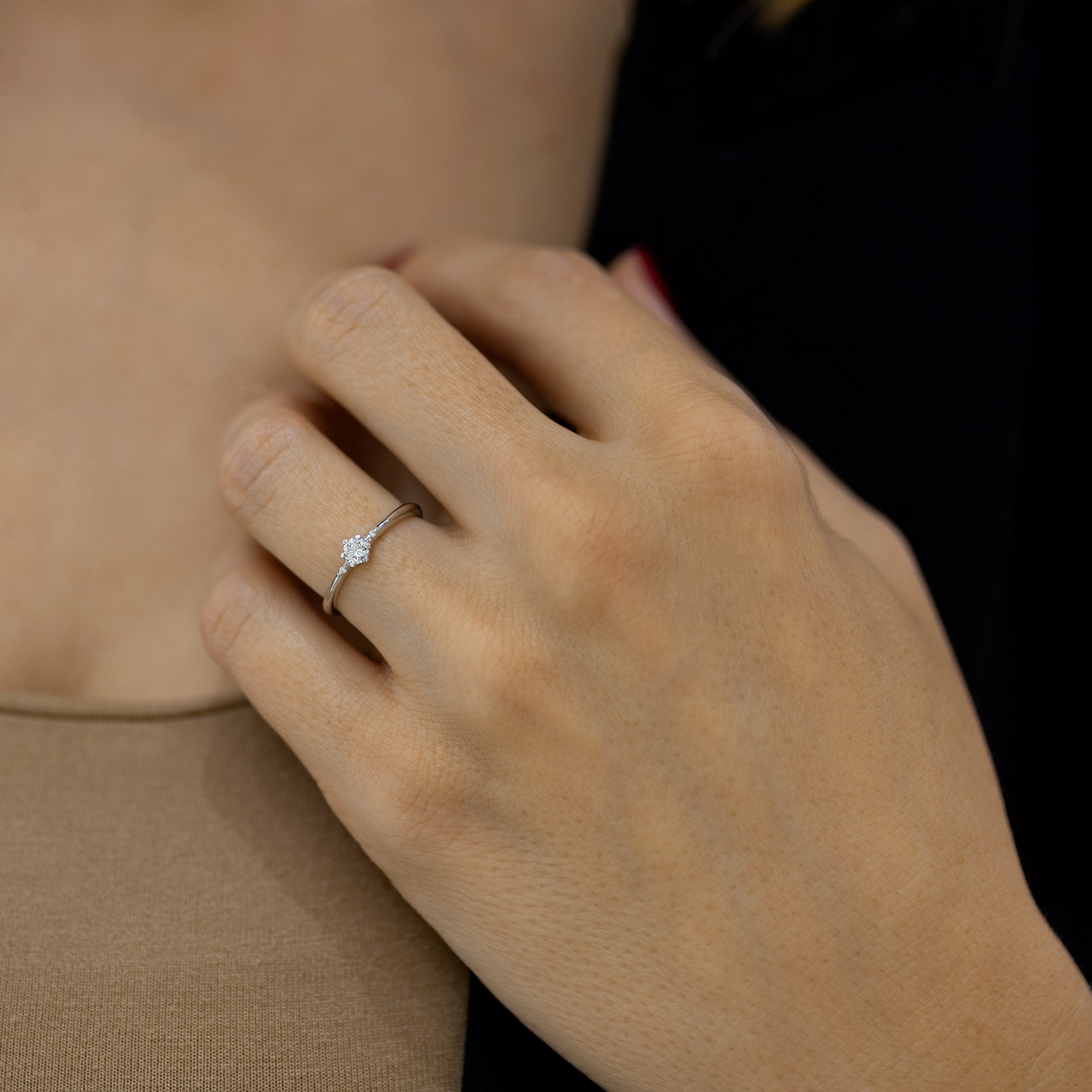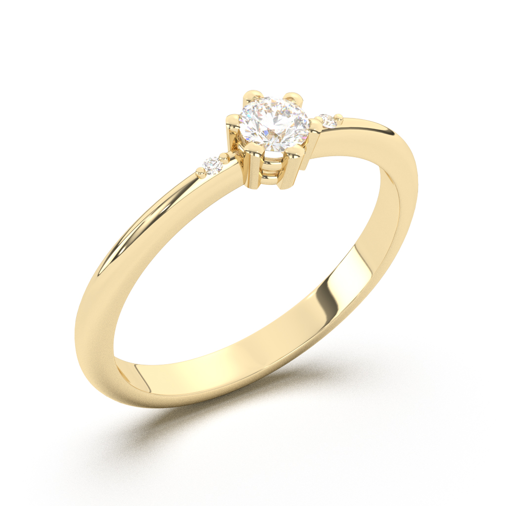 Verenički prsten svedenog dizajna, ukrašen sa tri dijamanta, jednim većim u sredini i po jednim sa svake strane. Veći kamen je osiguran sa šest držača zaobljenih ivica. Sam prsten može biti napravljen od belog, roze ili žutog zlata, finoće 14k ili 18k. U zlatari Andrejević Vam nudimo mogućnost da birate veličinu i sve ostale karakteristike dijamanta kako biste bili sigurni da će krajnji rezultat biti upravo dijamantski prsten kakav ste želeli.