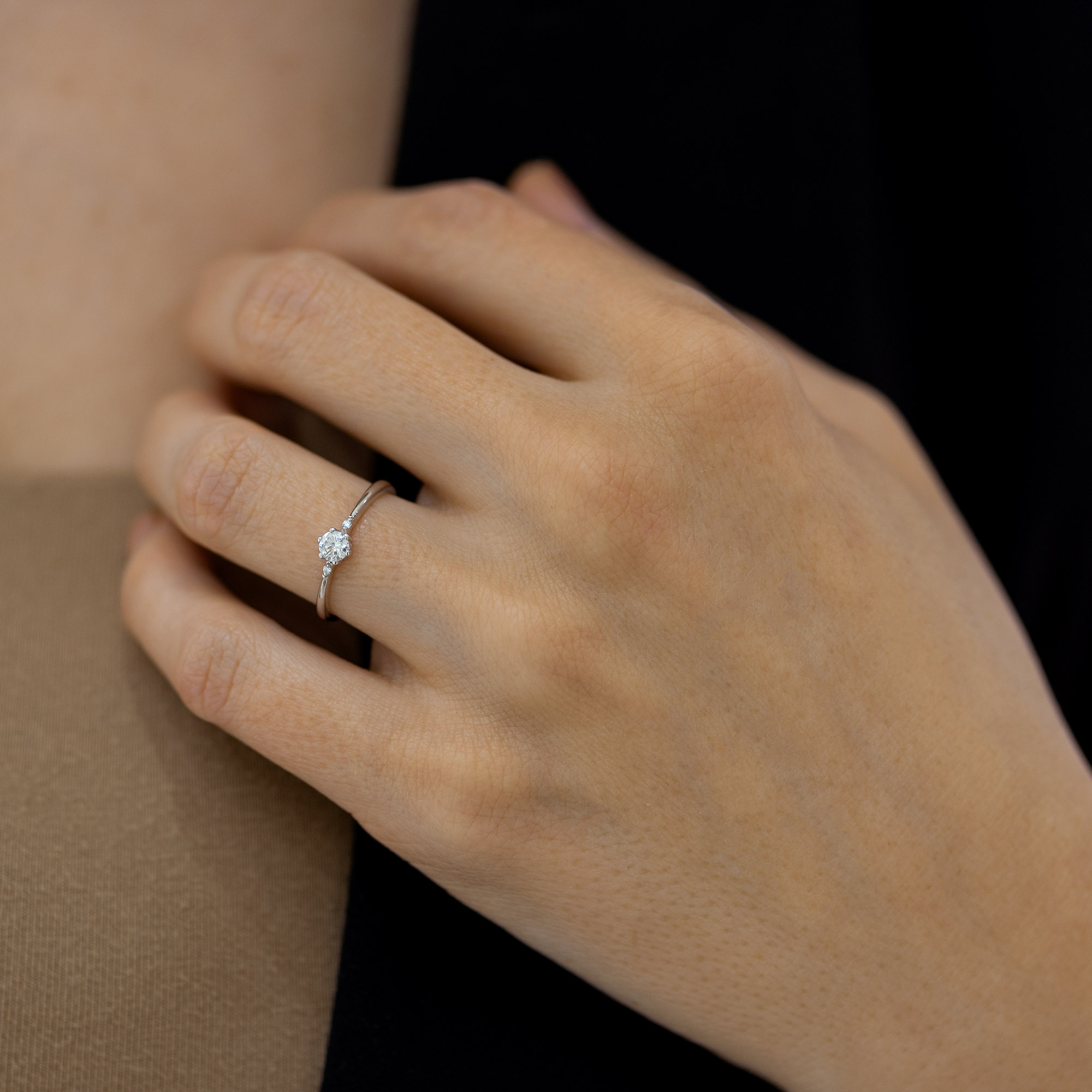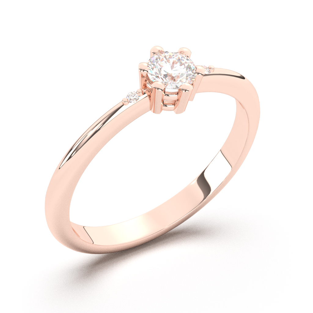 Verenički prsten svedenog dizajna, ukrašen sa tri dijamanta, jednim većim u sredini i po jednim sa svake strane. Veći kamen je osiguran sa šest držača zaobljenih ivica. Sam prsten može biti napravljen od belog, roze ili žutog zlata, finoće 14k ili 18k. U zlatari Andrejević Vam nudimo mogućnost da birate veličinu i sve ostale karakteristike dijamanta kako biste bili sigurni da će krajnji rezultat biti upravo dijamantski prsten kakav ste želeli.