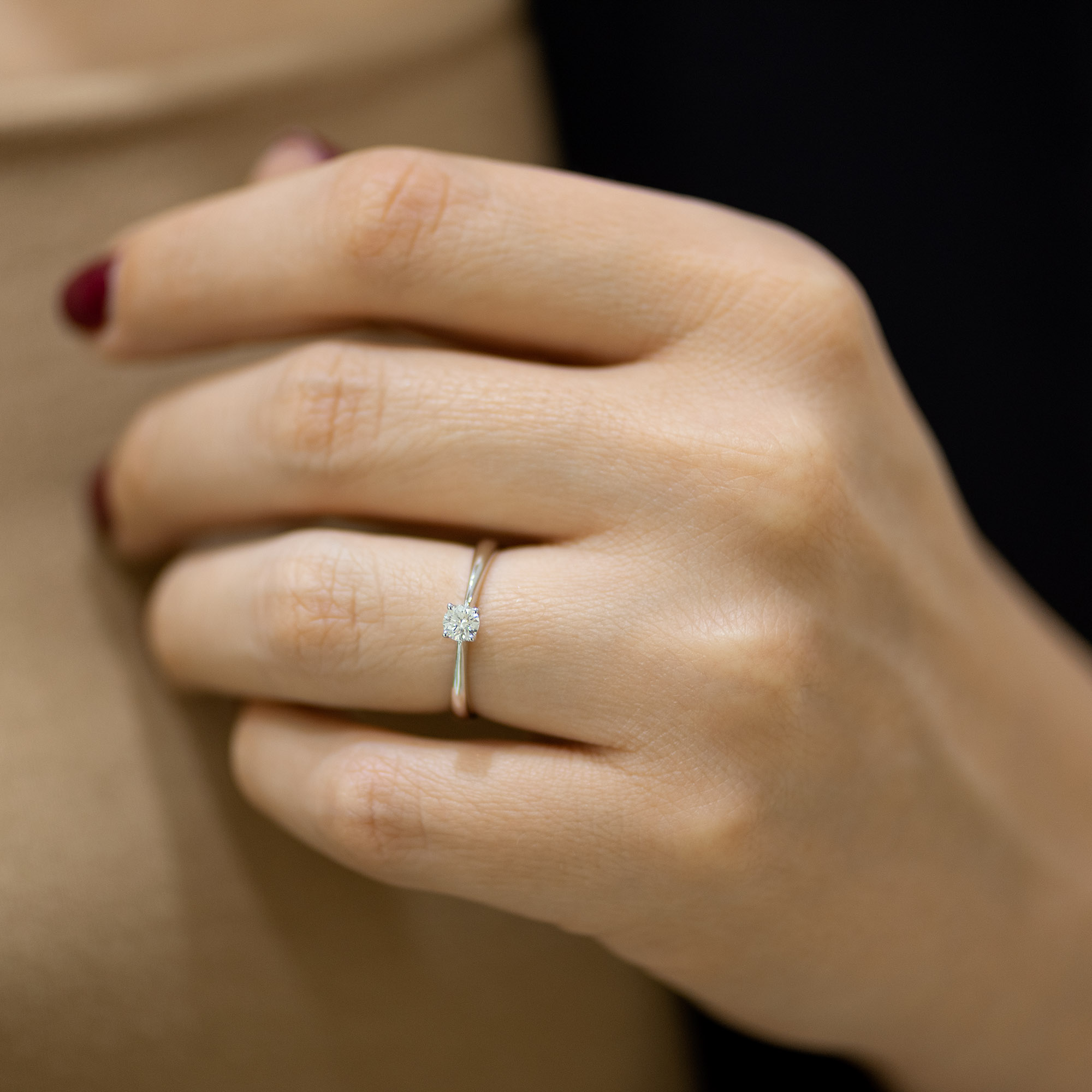 Verneički prsten soliter, klasičnog dizajna, sa idealno brušenim dijamantom odličnih svetlosnih karakteristika. Kružnica prstena se blago sužava na sredini i prstenu daje „cathedral“ siluetu, pritom ga čineći udobnim za nošenje. Naš nakit budi emociju u Vama, a kako biste bili sigurni da imate savršen verenički prsten, zlatara Andrejević nudi Vam mogućnost da sami izaberete karatažu, čistoću i boju dijamanata i drugog dragog kamenja, kao i boju zlata.