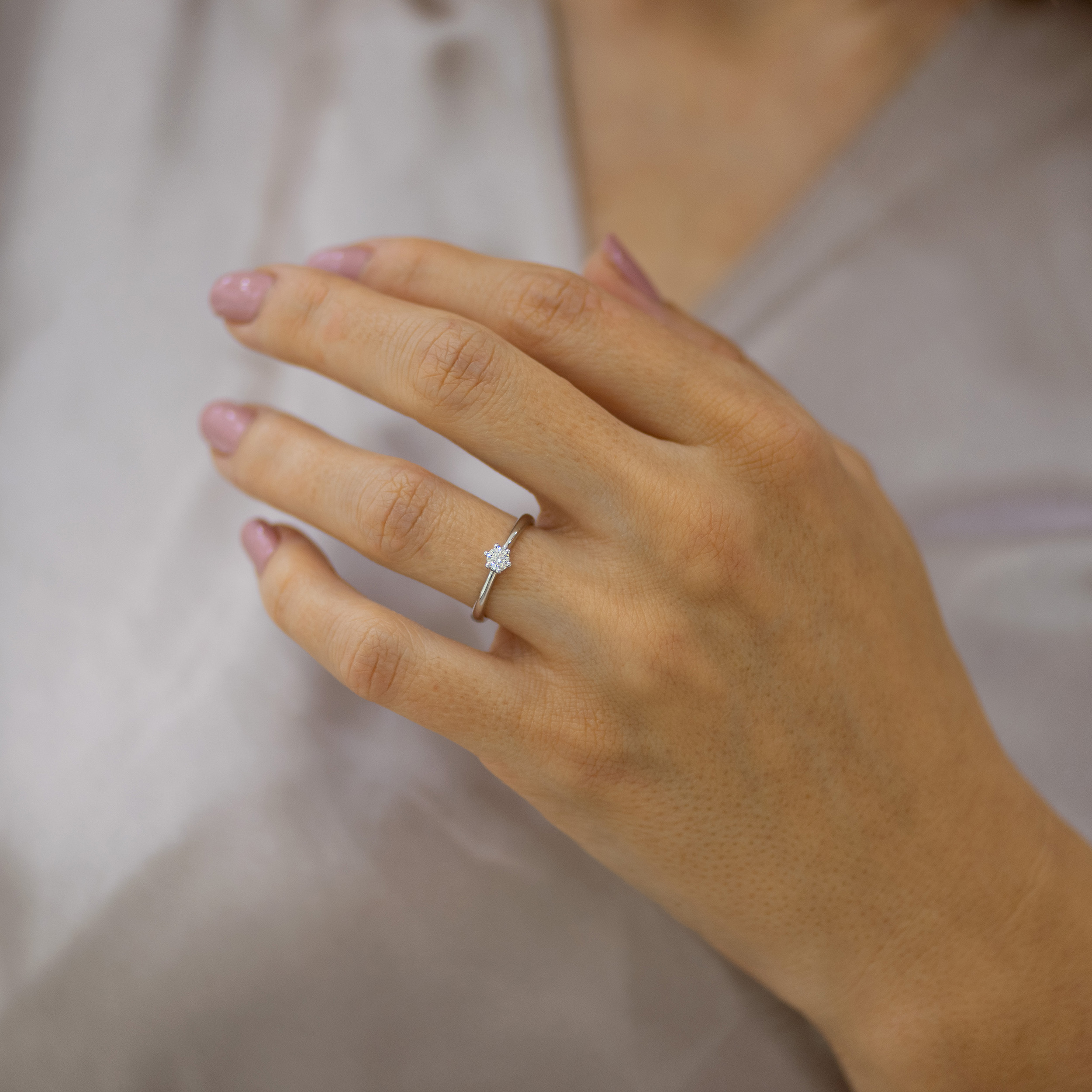 Verenički prsten soliter, jednostavnog dizajna koji odoleva vremenu. Šest držača oštrih stranica odlično se uklapaju sa stranicama dijamanta i dodatno doprinose bogatom efektu odblesaka svetlosti. Za bogati efekat odblesaka svetlosti su zaslužne idealne proporcije dijamanta i perfektna obrada prstena. Sam prsten može biti napravljen od belog, roze ili žutog zlata, finoće 14k ili 18k.