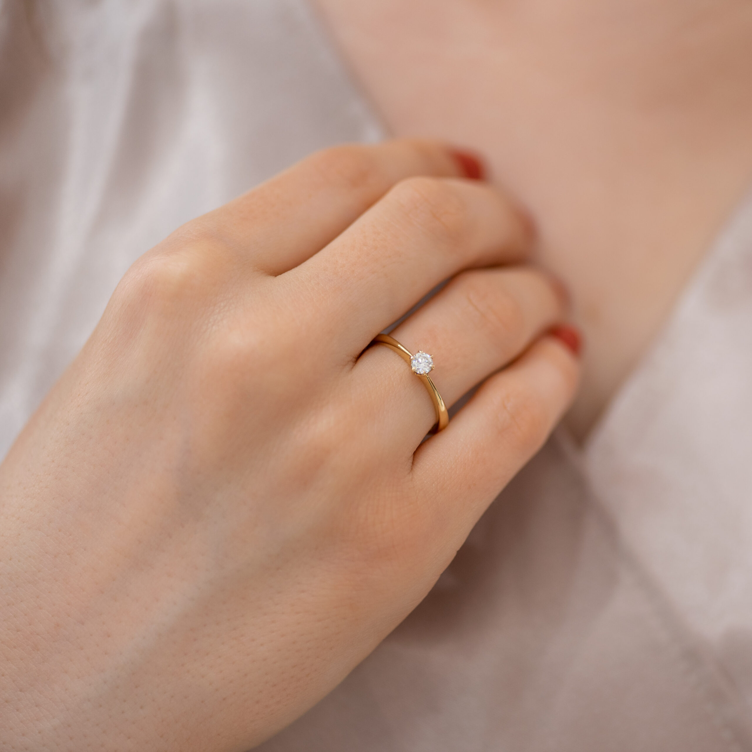 Verenički prsten soliter, oblih ivica i jednostavnog dizajna koji odoleva vremenu. Šest držača oštrih stranica odlično se uklapaju sa stranicama dijamanta i dodatno doprinose bogatom efektu odblesaka svetlosti. Sam prsten može biti napravljen od belog, roze ili žutog zlata.