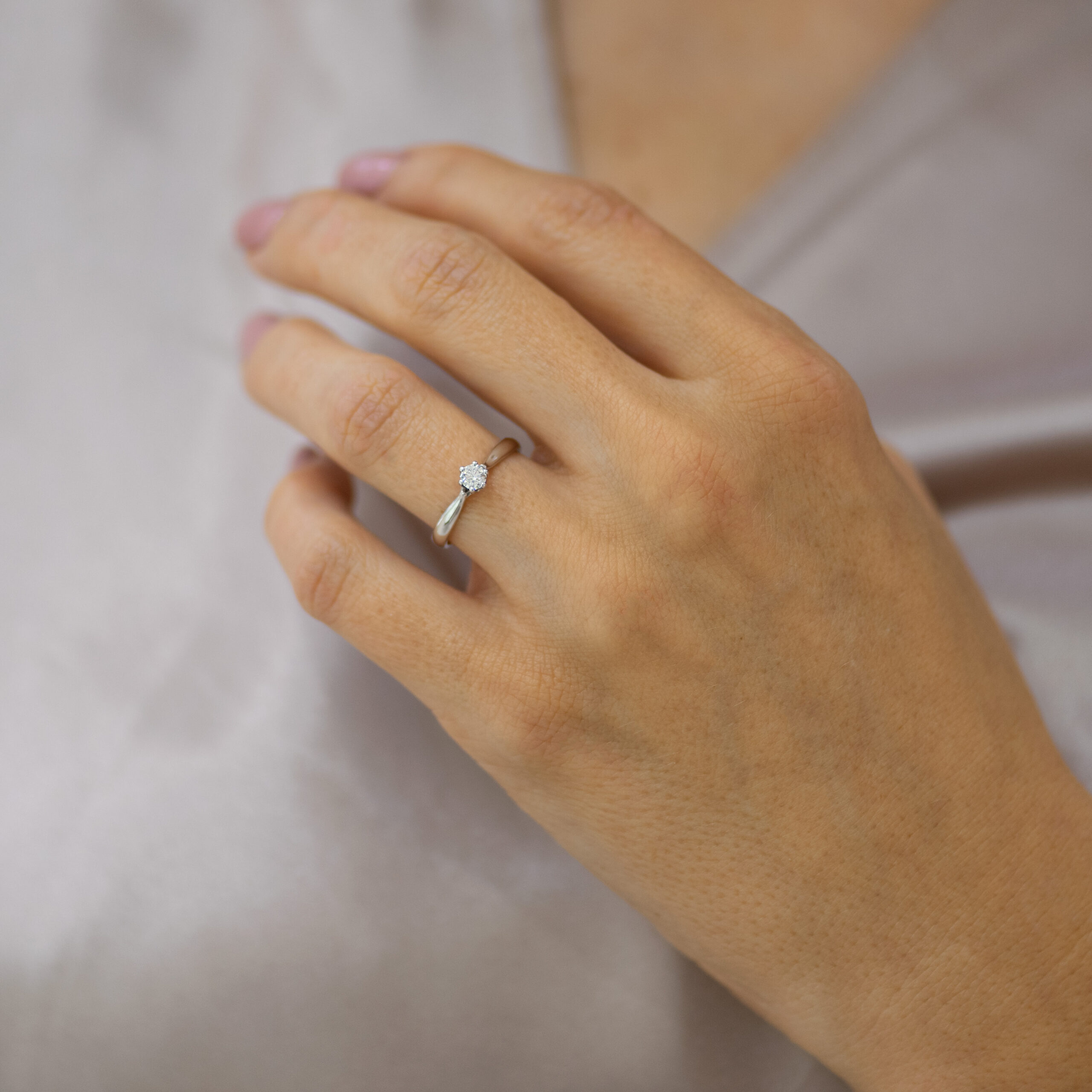 Verenički prsten od 14-karatnog zlata jednostavnog i svedenog dizajna. Kružnica prstena je na kreativan način prekinuta kako bi iz nje poput lišća iznikli držači kamena. Šest stilizovanih držača zaobljenih ivica drže dijamant malo izdignutim kako bi lepše hvatao i prelamao svetlo. U zlatari Andrejević, nudimo Vam mogućnost da sami izaberete karatažu, čistoću i boju dijamanta kako biste bili sigurni da će krajnji rezultat biti upravo verenički prsten kakav ste želeli.