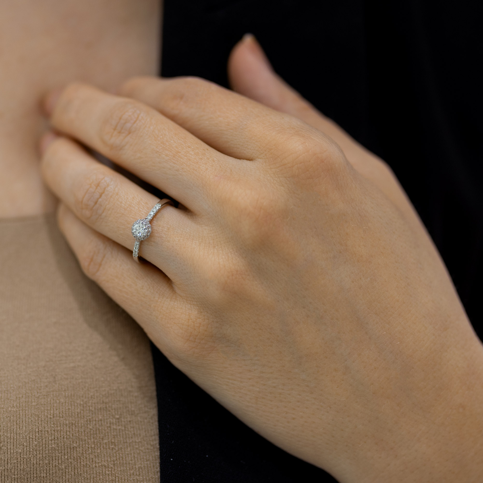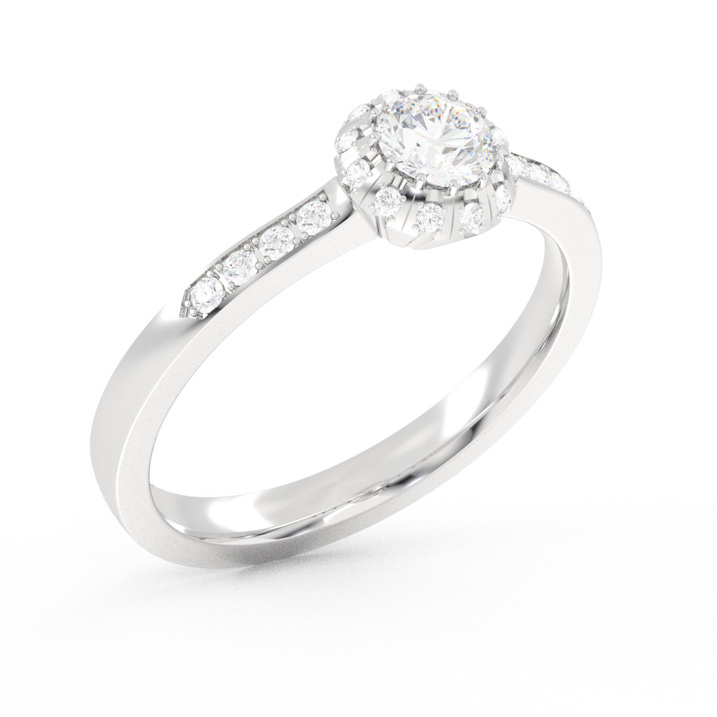 Verenički prsten klasičnog dizajna na kom dominira dijamant. „Halo“ model vereničkog prstena gde veći centralni brilijant okružuju manji, privlači pažnju svojim blistavim sjajem. Brilijanti su ufasovani i u samu kružnicu prstena, čineći ga još elegantnijim i luksuznijim. U zlatari Andrejević, nudimo Vam mogućnost da sami izaberete karatažu, čistoću i boju dijamanta, kao i boju zlata, kako biste bili sigurni da će krajnji rezultat biti upravo verenički prsten kakav ste želeli.