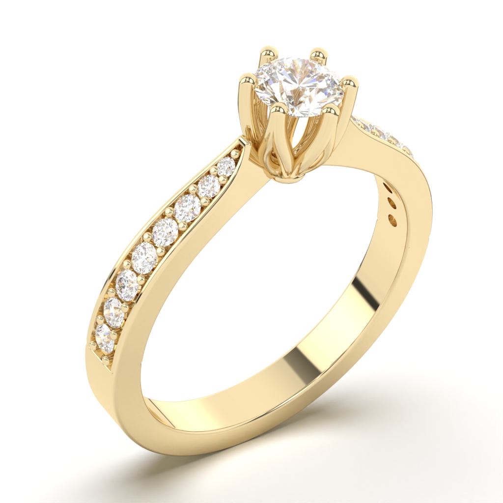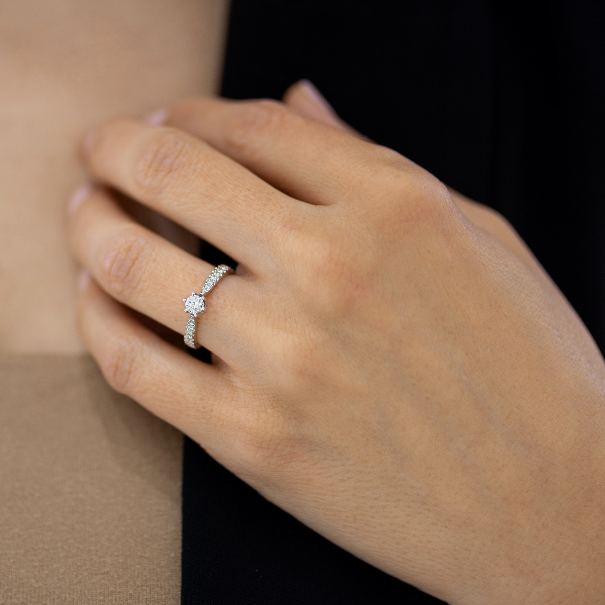 Klasičan verenički prsten koji krase dijamanti. Jedan idealno brušen dijamant sa odličnim svetlosnim karakteristikama, postavljen je u stilizovnao ležište koje čine držači, dok je sa svake strane centralnog kamena u samu kružnicu prstena ufasovano po osam manjih dijamanta.Kada je u pitanju vereničko prstenje, belo zlato je veoma popularno, a zlatara Andrejević nudi mogućnost izrade vereničkog prstenja od roza, kao i od žutog zlata. Posetite zlatare Andrejević Beograd jer uz naš vrhunski dizajnerski tim, izrada nakita po Vašoj želji nikada nije bila lakša.