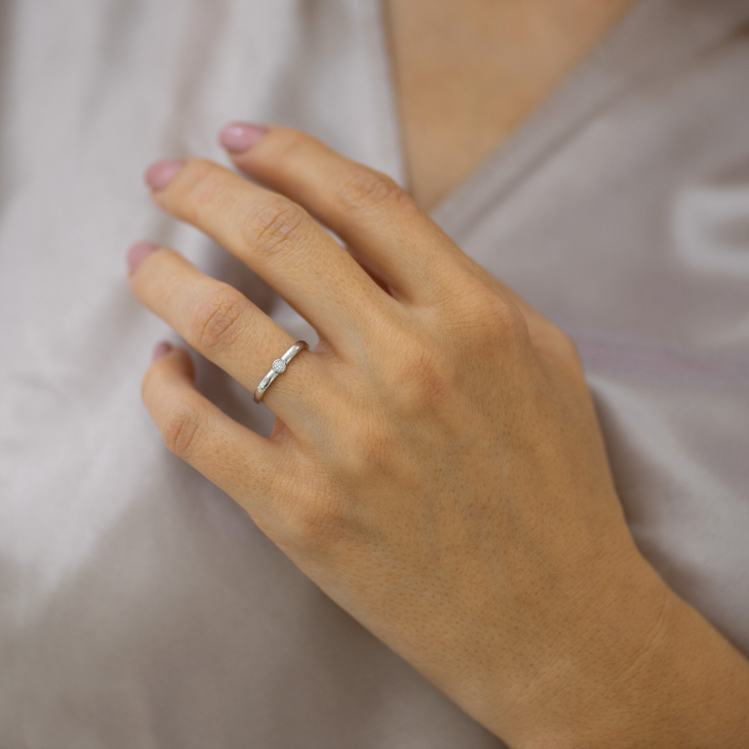 Verenički prsten romantičnog dizajna sa jednim dijamantom. Sladak i delikatan prsten koji se lepo uklapa uz ostali nakit i može se udobno nositi svaki dan. Sam prsten može biti napravljen od belog, roze ili žutog zlata.