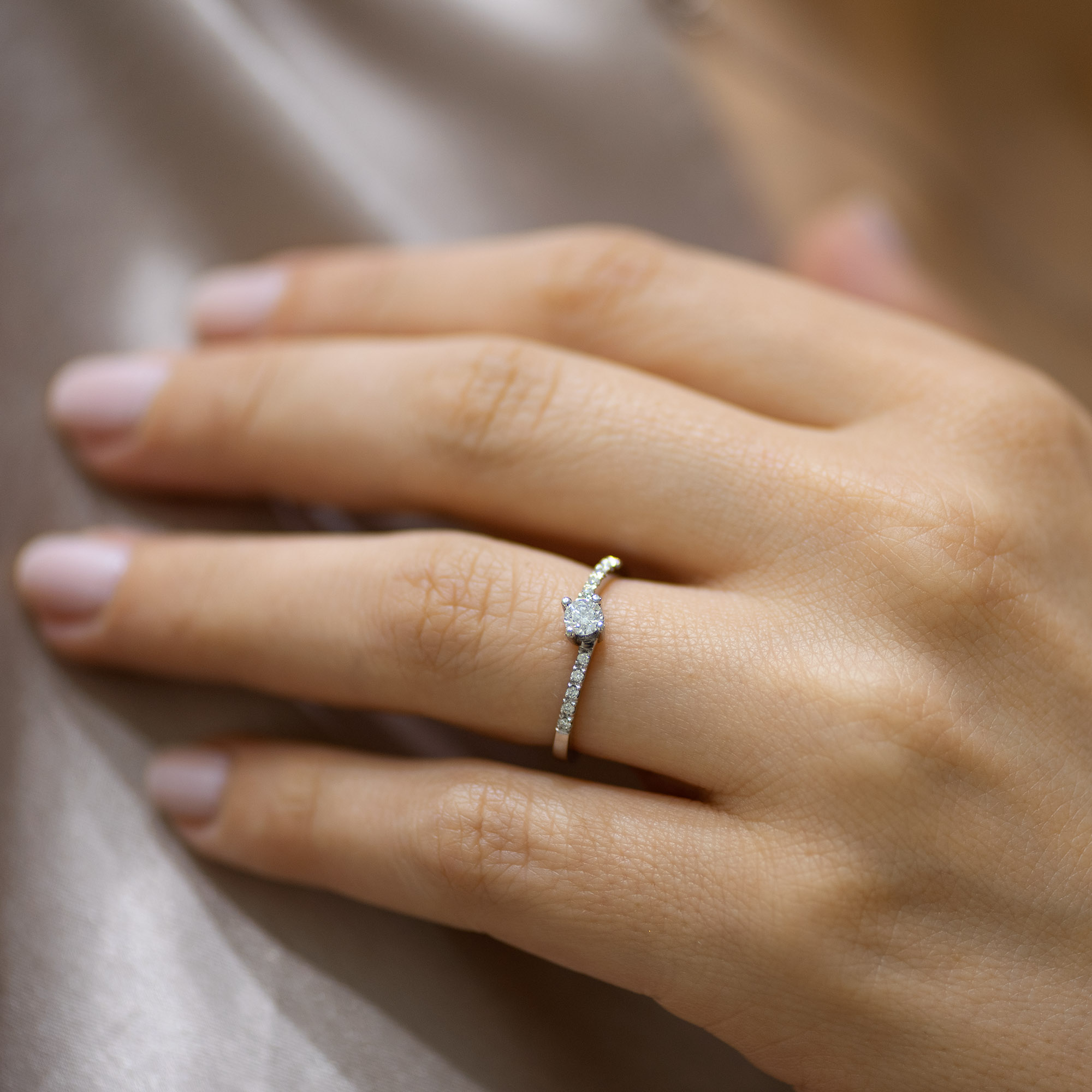 Verenički prsten modernog dizajna. Prsten je ukrašen sa čak 11 dijamanata manje karataže, od kojih je 10 raspoređeno po kružnici prstena sa svake strane centralnog kamena. Sama kružnica prstena je prekinuta i na mestu gde se dva kraka naslanjaju jedan na drugi, četiri oblo brušena držača pridržavaju centralni kamen. Manje kamenje kreativno je ufasetirano u kružnicu prstena bez standardnih držača. Sam prsten može biti napravljen od 14-karatnog ili 18-karatng zlata u boji po Vašem izboru. U zlatari Andrejević, nudimo Vam mogućnost da sami izaberete karatažu, čistoću i boju dijamanta kako biste bili sigurni da će krajnji rezultat biti upravo verenički prsten kakav ste želeli.