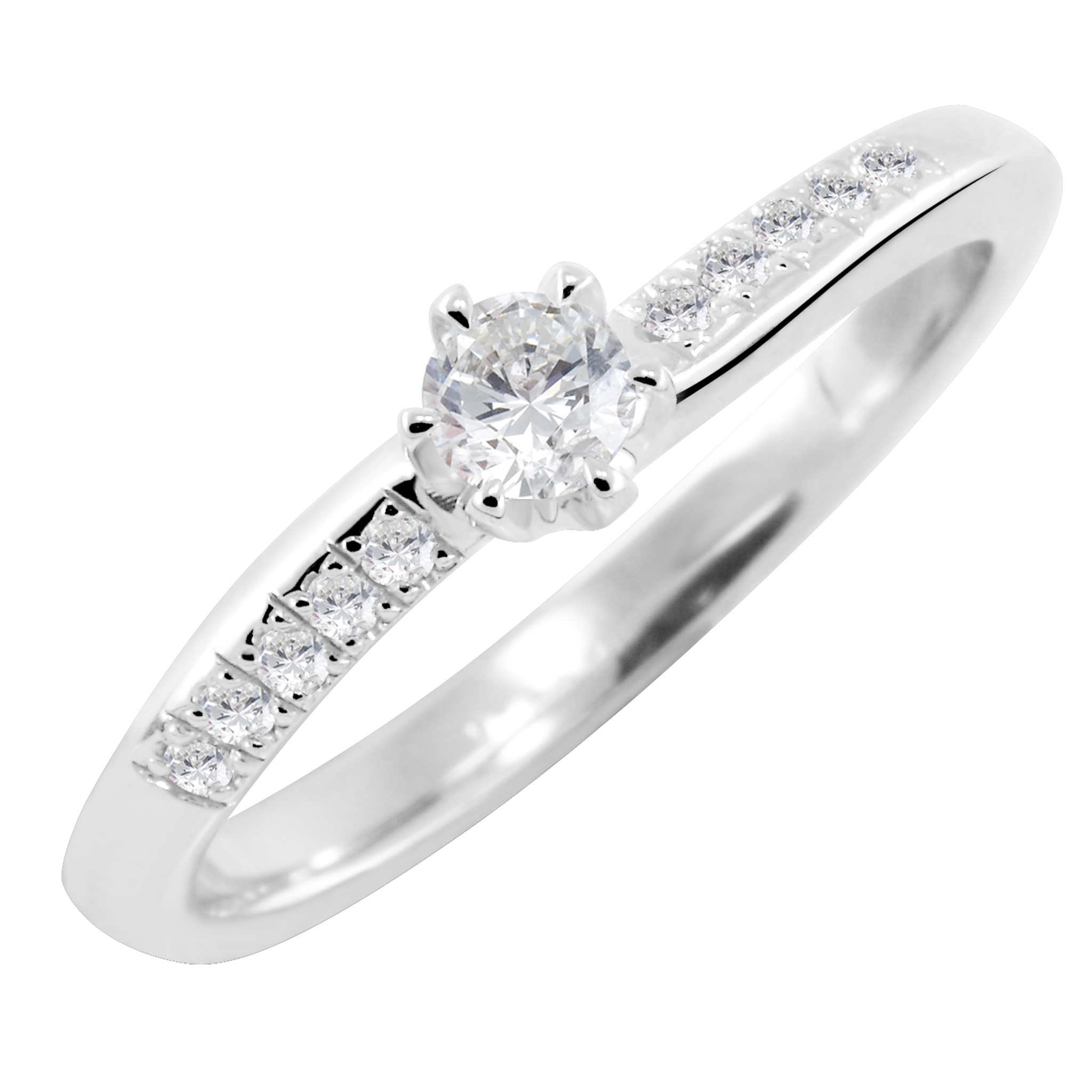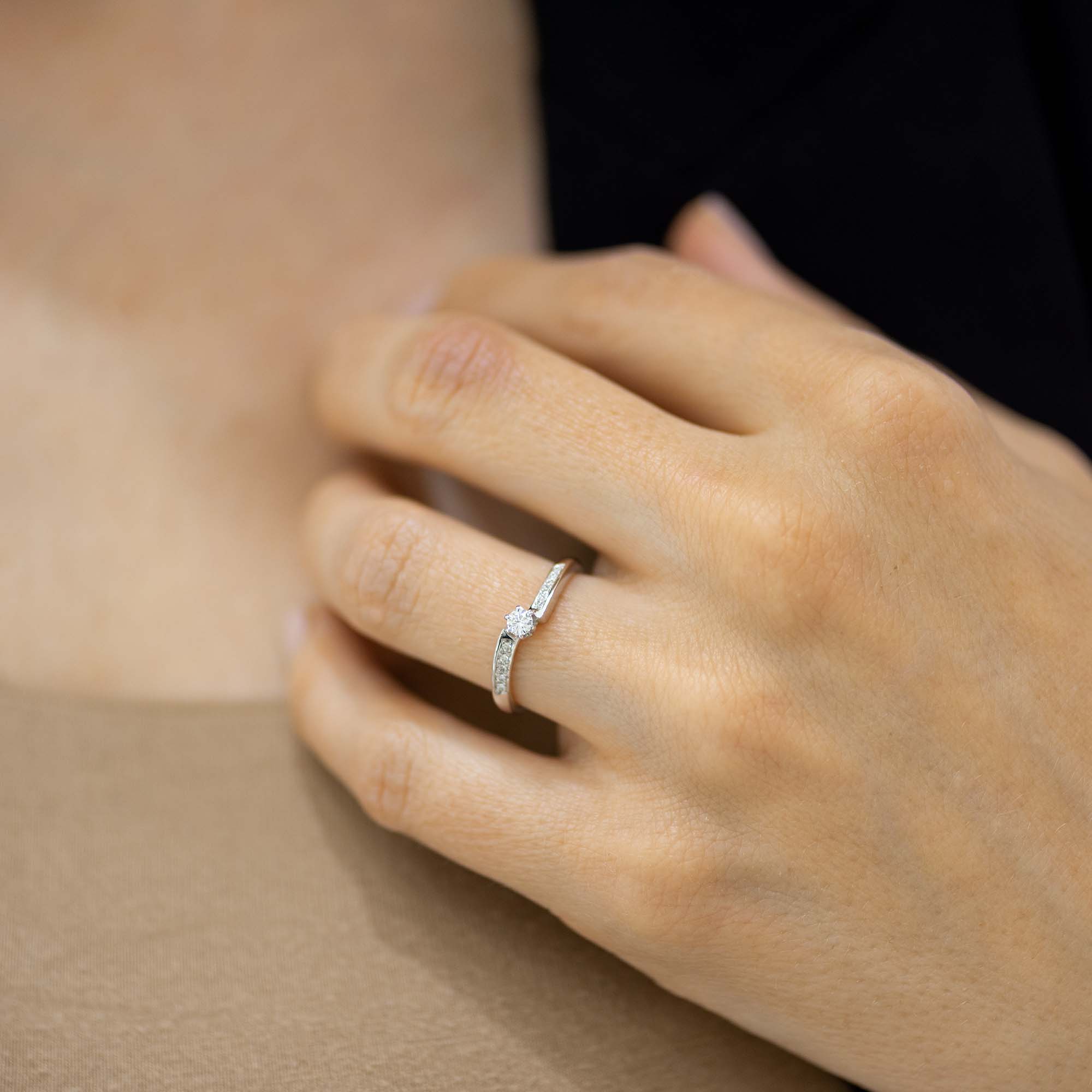 Verenički prsten koji će učiniti da njena kompeltna pojava bude zadivljujuća. Od vereničkog prstena traži se blistavost, a ova prsten je nudi u velikoj količini. Zaslužni za to su dijamanti. Ukupno ih je 11. Jedan veći, sa čije obe strane se pruža po red manjih. Prsten koji je predodređen da bude kruna pozitivnog odgovora.