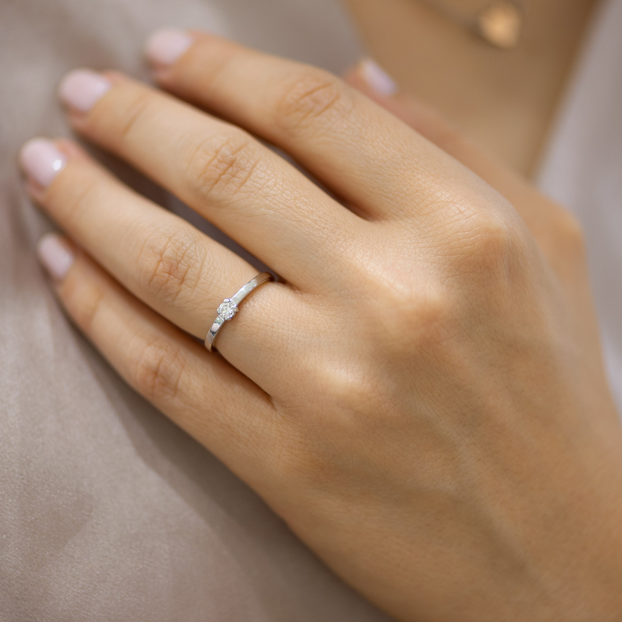 Ne propustite njen najširi osmeh i poklonite joj jedan zaista poseban prsten. Savršeno će se uklopiti uz Vaše pitanje:,, Da li želiš da se udaš za mene?” Klasičan oblik prstena ,,začinjen” je zlatnim držačima geometrijskog oblika. Kamen perfektne obrade utisnut je među njih. Kvalitet dijamanta garantovan je sertifikatom uz kupovinu. Prsten može biti izrađen i u drugoj boji zlata (žutoj ili roze).