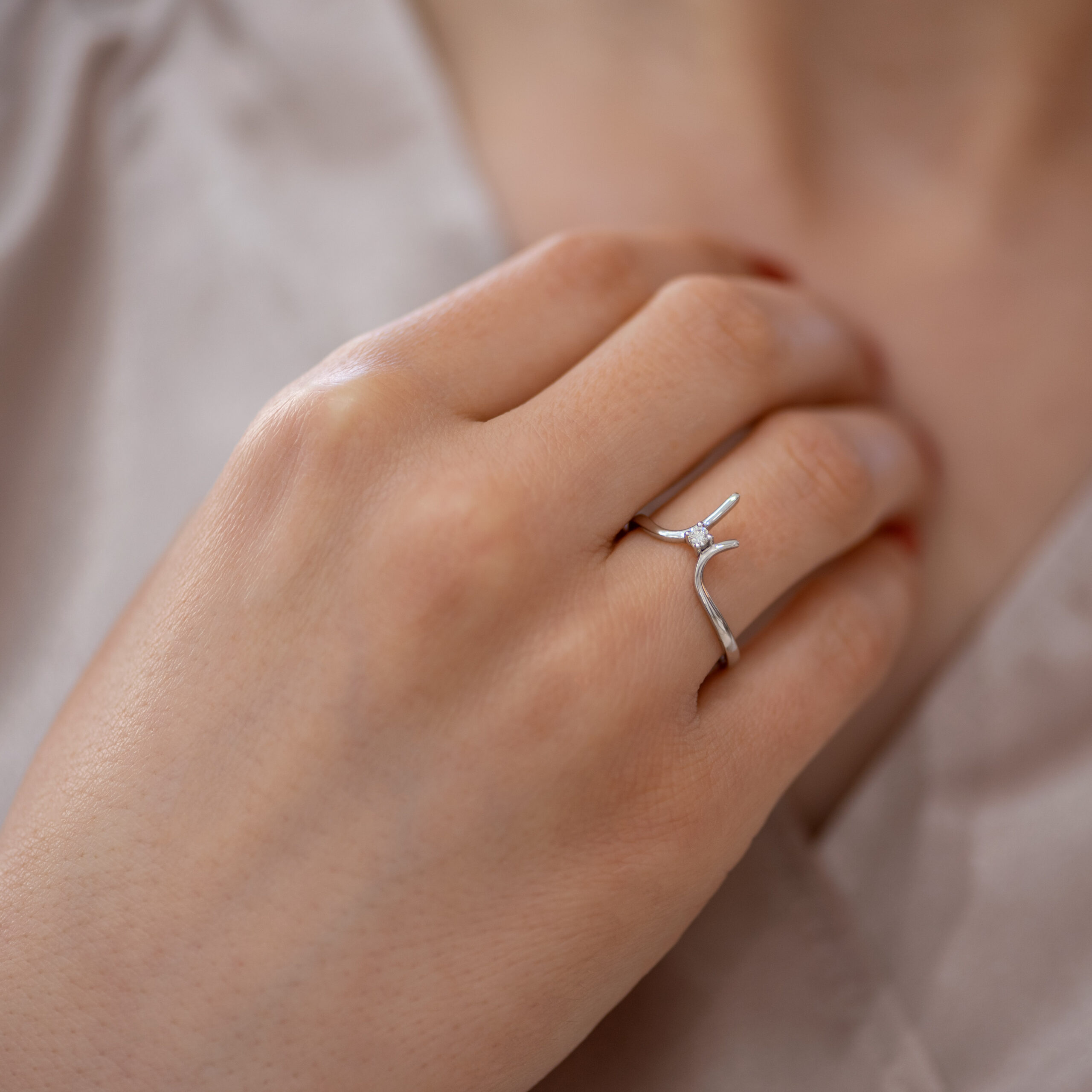 Verenički prsten koji spaja suprotnosti. Sveden a elegantan, minimalistički i moderan, ovaj verenički prsten od zlata neizostavno će da privuče pažnju. Kružnica prstena je prekinuta, ali kraci se pružaju jedan pored drugog ali se ne dodiruju. Između kraka se nalazi kamen manje karataže pričvršćen sa četiri držača oblo brušenih vrhova. Sam prsten može biti napravljen od belog, roze ili žutog zlata, finoće 14k.