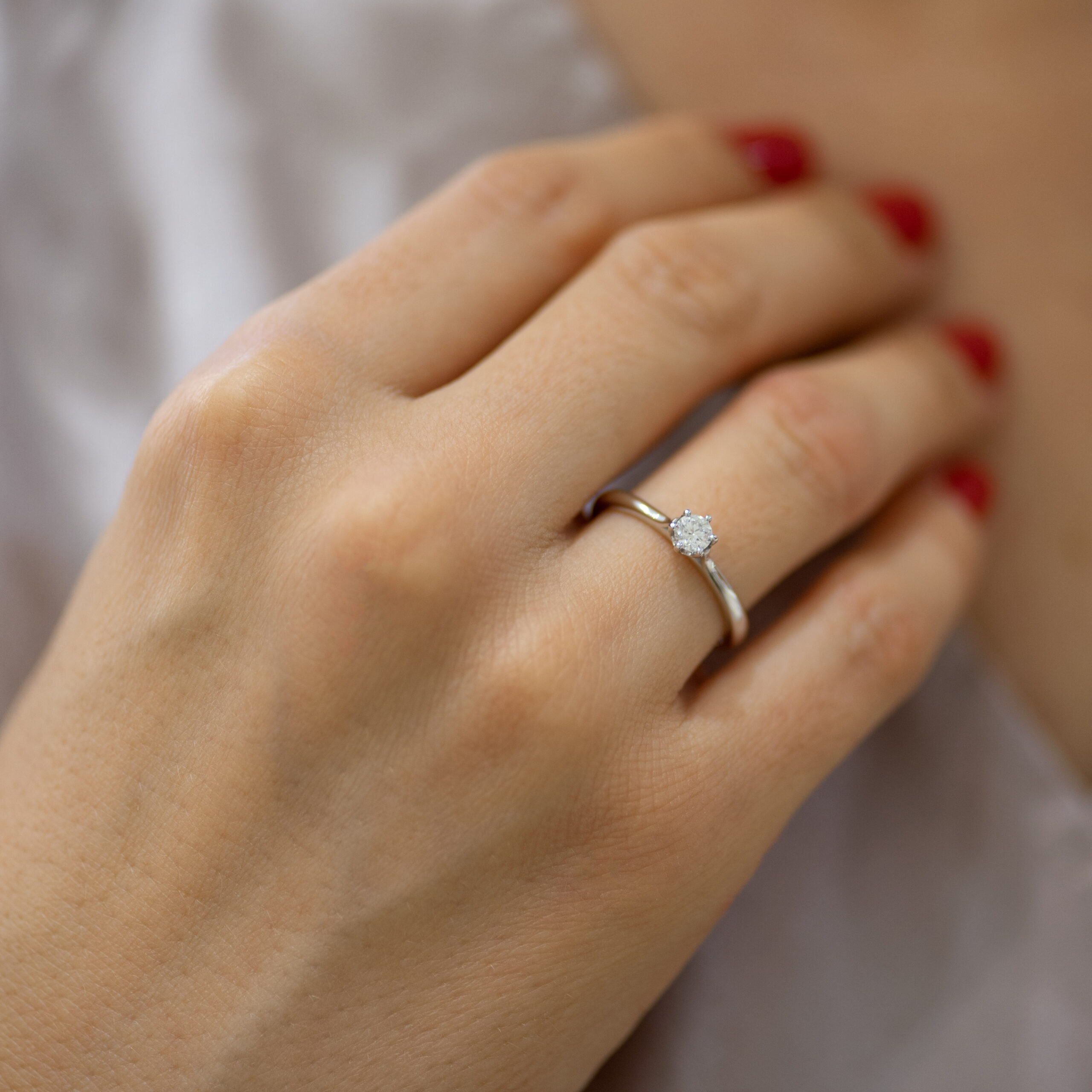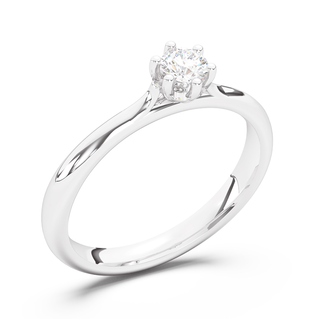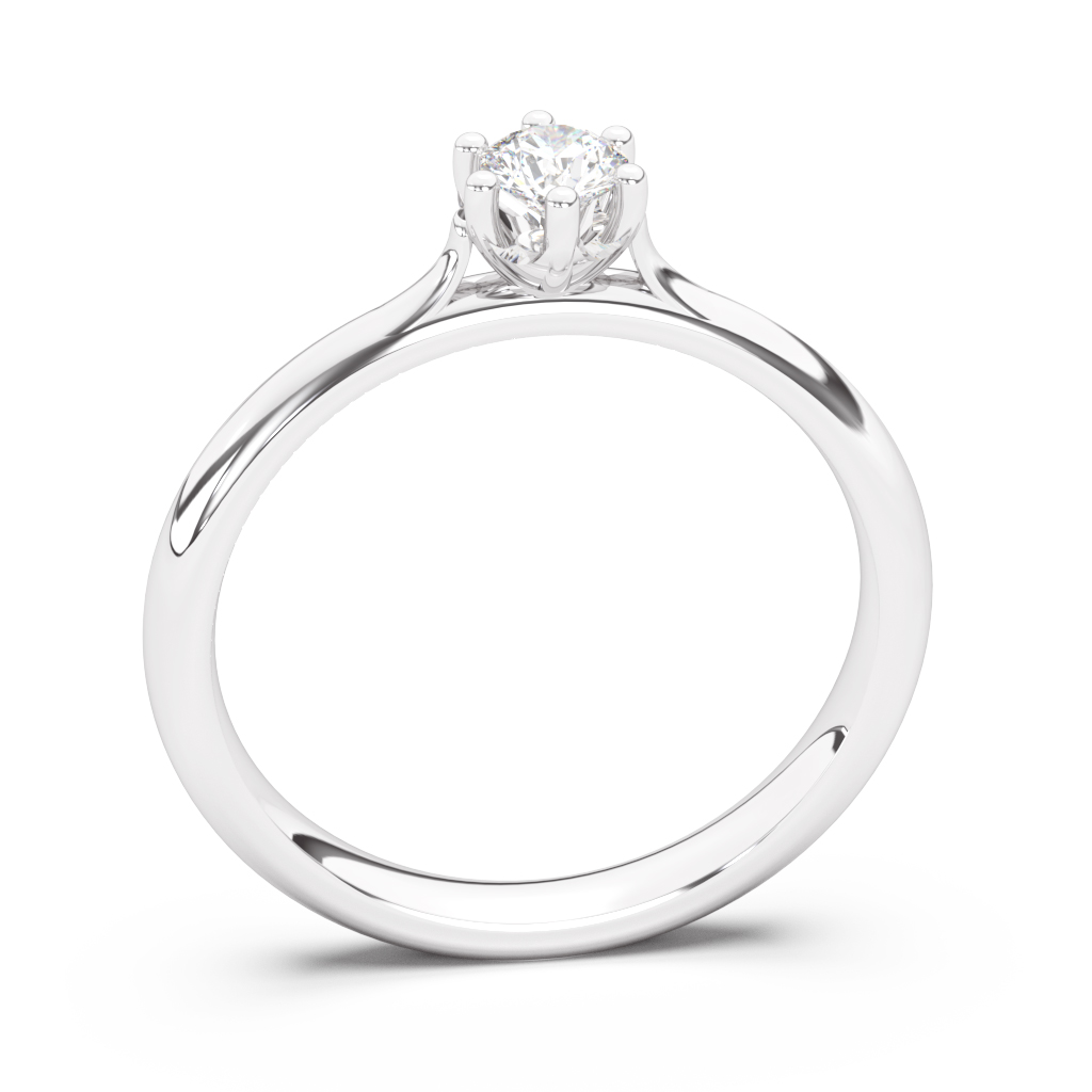 Verenički prsten soliter napravljen od najkvalitetnijeg 14-karatnog zlata. Jednostavan i sveden dizajn čine ga vanremenskim i elegantnim. Kružnica prstena je na kreativan način prekinuta kako bi se kraci izvili pored držača kamena nalik laticama cveta. Šest držača zaobljenih ivica drže dijamant blago izdignutim kako bi lepše hvatao i prelamao svetlo. U zlatari Andrejević, nudimo Vam mogućnost da sami izaberete karatažu, čistoću i boju dijamanta, kao i boju zlata, kako biste bili sigurni da će krajnji rezultat biti upravo verenički prsten kakav ste želeli.