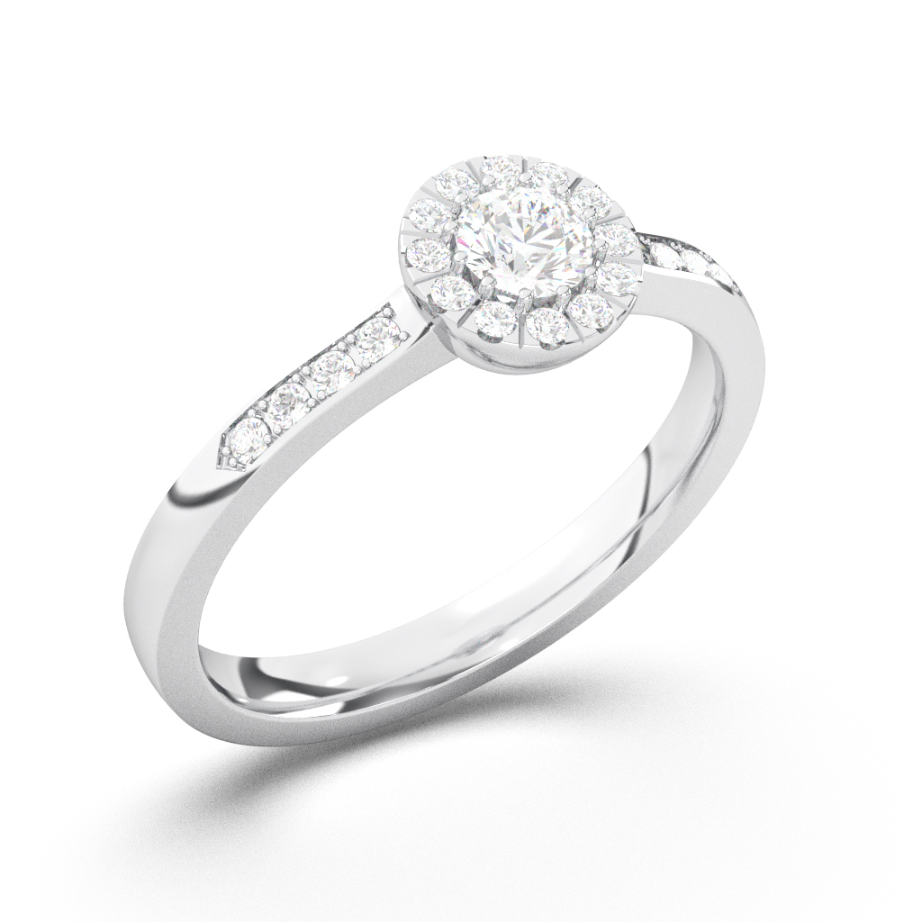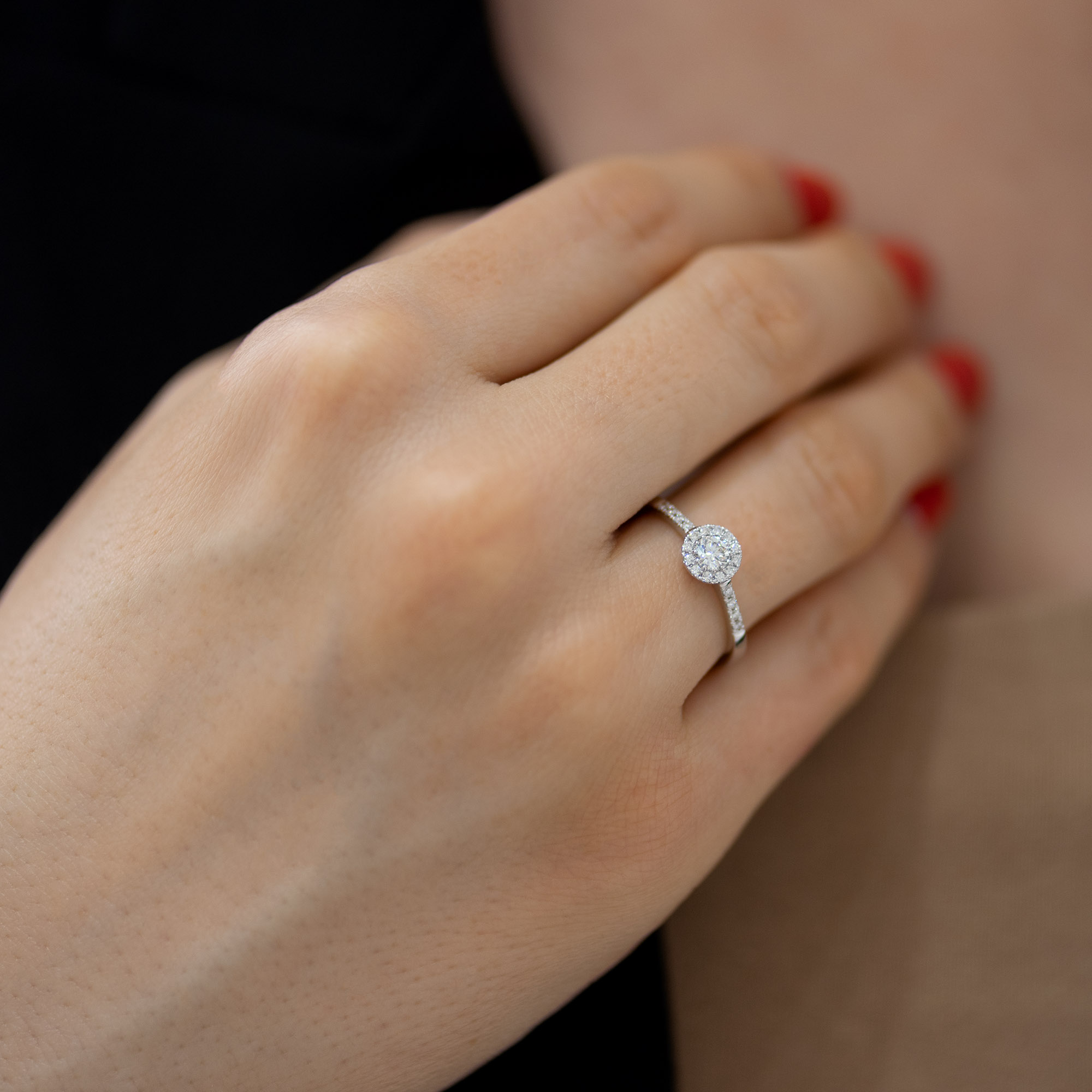 Verenički prsten klasičnog dizajna na kom dominiraju dijamanti. Pred Vama je „Halo“ model vereničkog prstena gde veći centralni kamen okružuju sitni, blistavi dijamanti. Dijamanti su takođe ufasovani i u samu kružnicu prstena, dodajući na taj način dozu luksuza i elegancije što čini da ovaj verenički prsten privlači pažnju svojim raskošnim sjajem. Naš nakit budi emociju u Vama, a kako biste bili sigurni da imate savršen verenički prsten, zlatara Andrejević nudi Vam mogućnost da sami izaberete karatažu, čistoću i boju dijamanata i drugog dragog kamenja, kao i boju zlata.