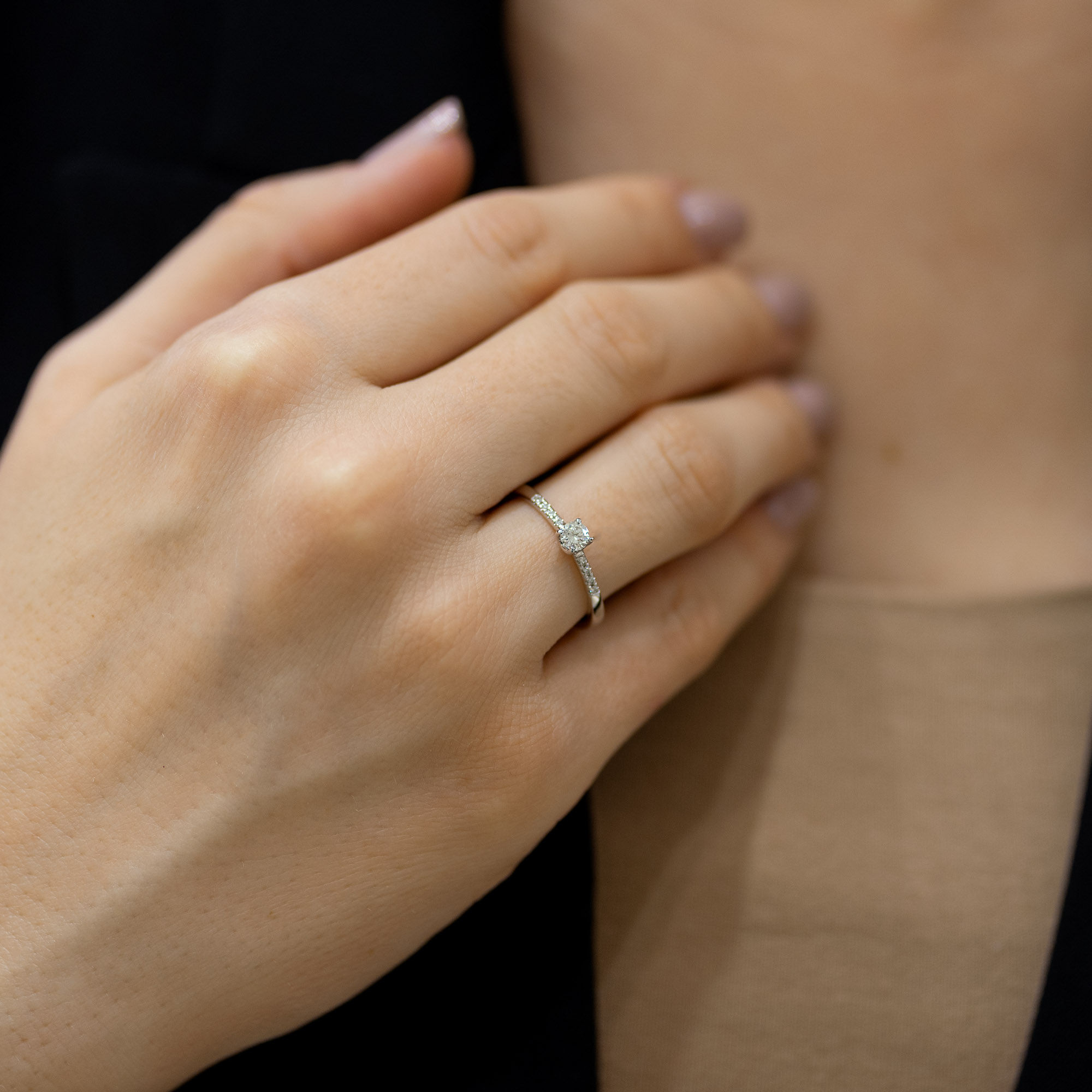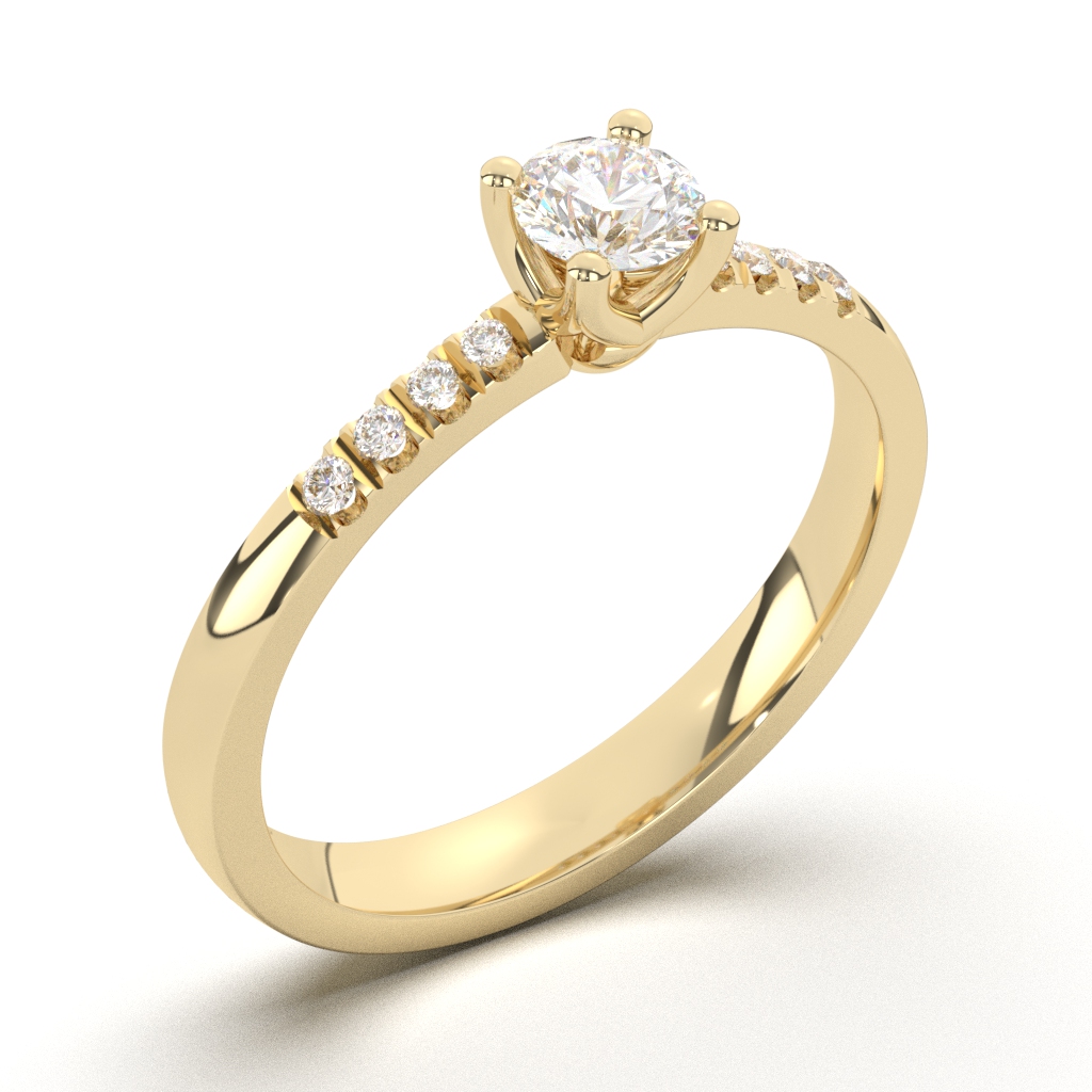 Klasičan verenički prsten koji krase dijamanti. Jedan idealno brušen dijamant sa odličnim svetlosnim karakteristikama, postavljen je u stilizovnao ležište koje čine držači, dok su sa svake stane centralnog kamena u samu kružnicu prstena ufasovana po četiri manja dijamanta. Kombinacija žutog zlata i blistavih dijamanata dala je savršen prsten za veridbu. Kada je u pitanju vereničko prstenje, žuto zlato je neprevaziđena klasika, a zlatara Andrejević nudi mogućnost izrade vereničkog prstenja od roza, kao i od belog zlata. Posetite zlatare Andrejević Beograd jer uz naš vrhunski dizajnerski tim, izrada nakita po Vašoj želji nikada nije bila lakša.